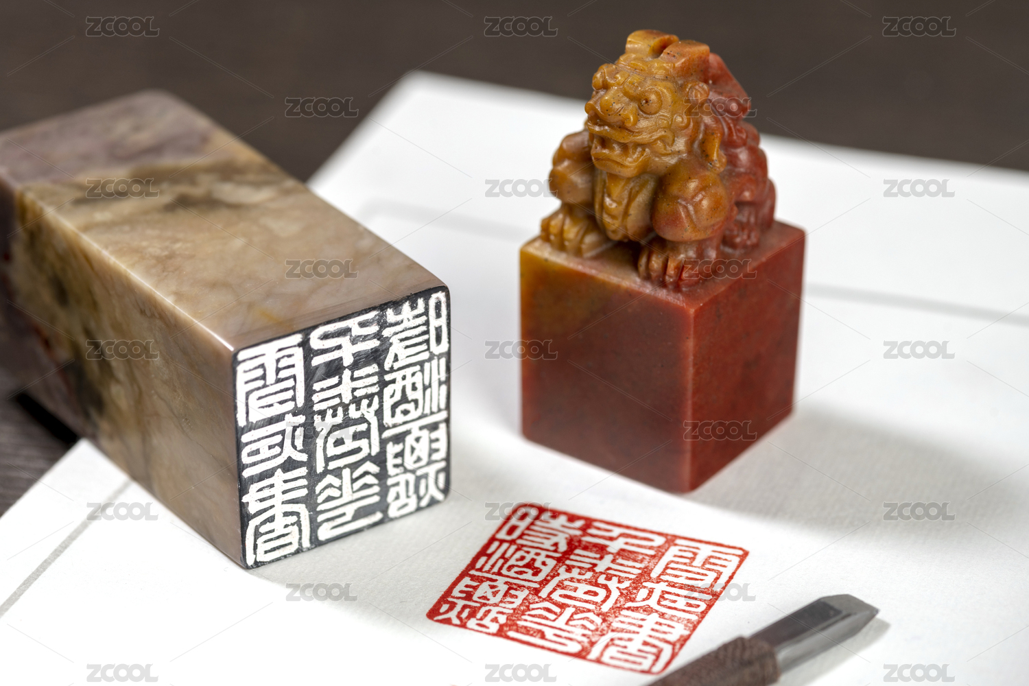 篆刻艺术印章刻刀印谱印泥摆放在桌面上