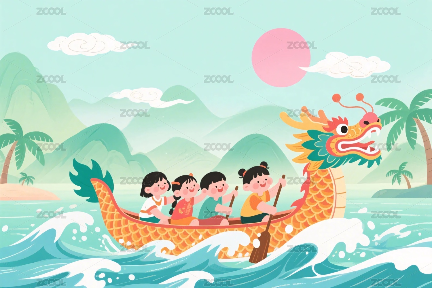 端午节赛龙舟传统节日活动粽子美食国潮插画