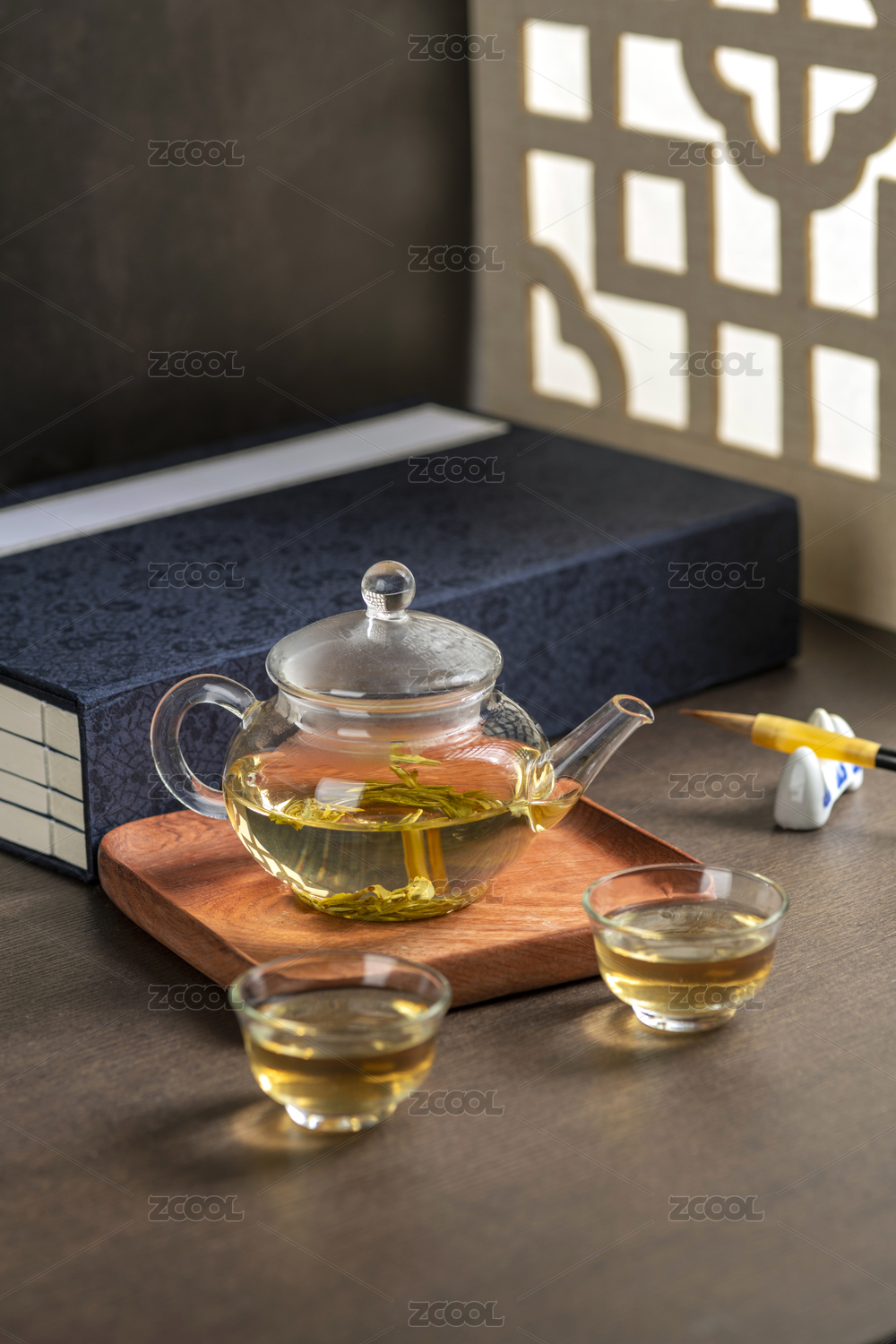 仿古玻璃茶壶冲泡的茶水摆放在窗棂影木桌面