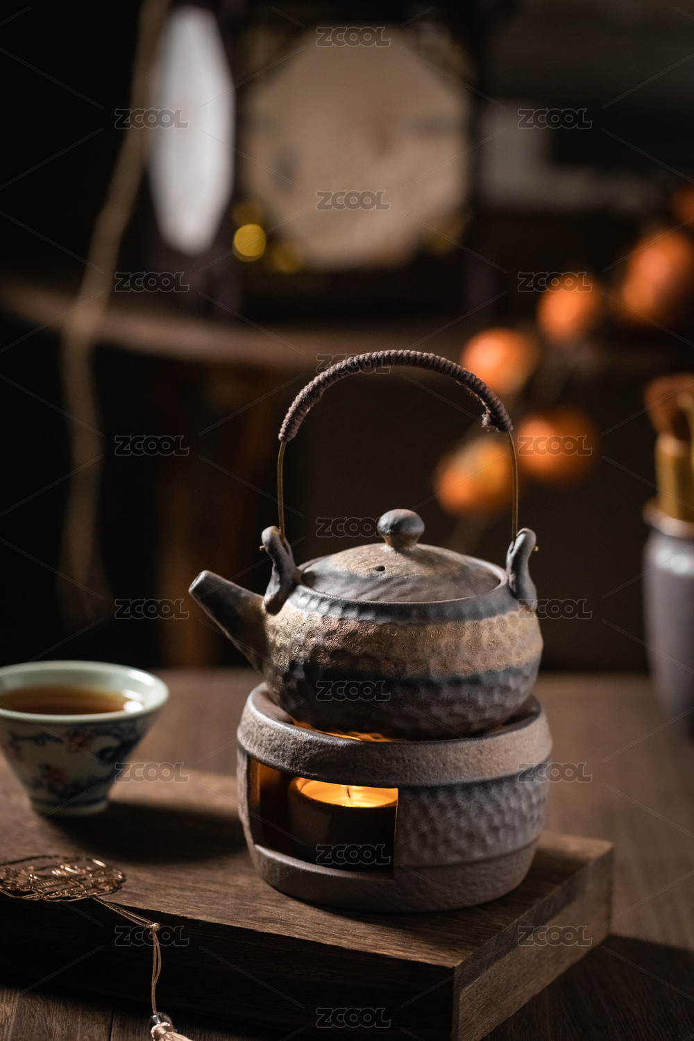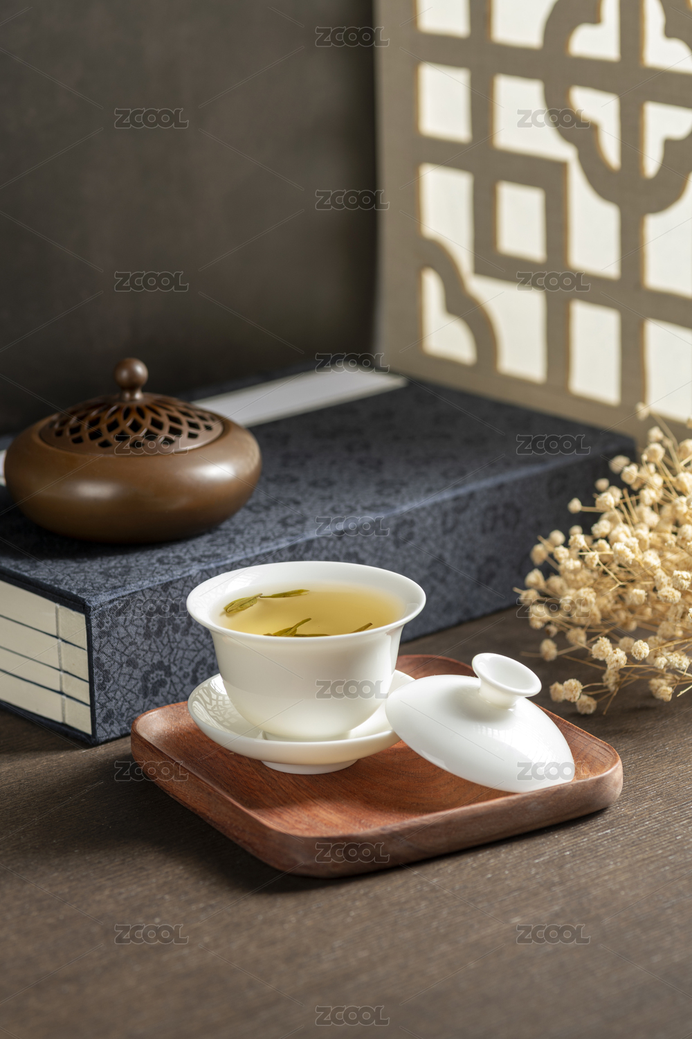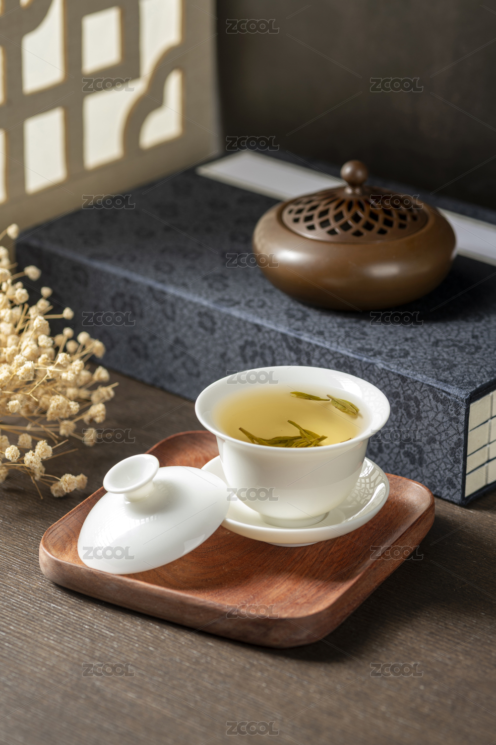 一杯盖碗茶与紫铜香炉摆放在木托盘中