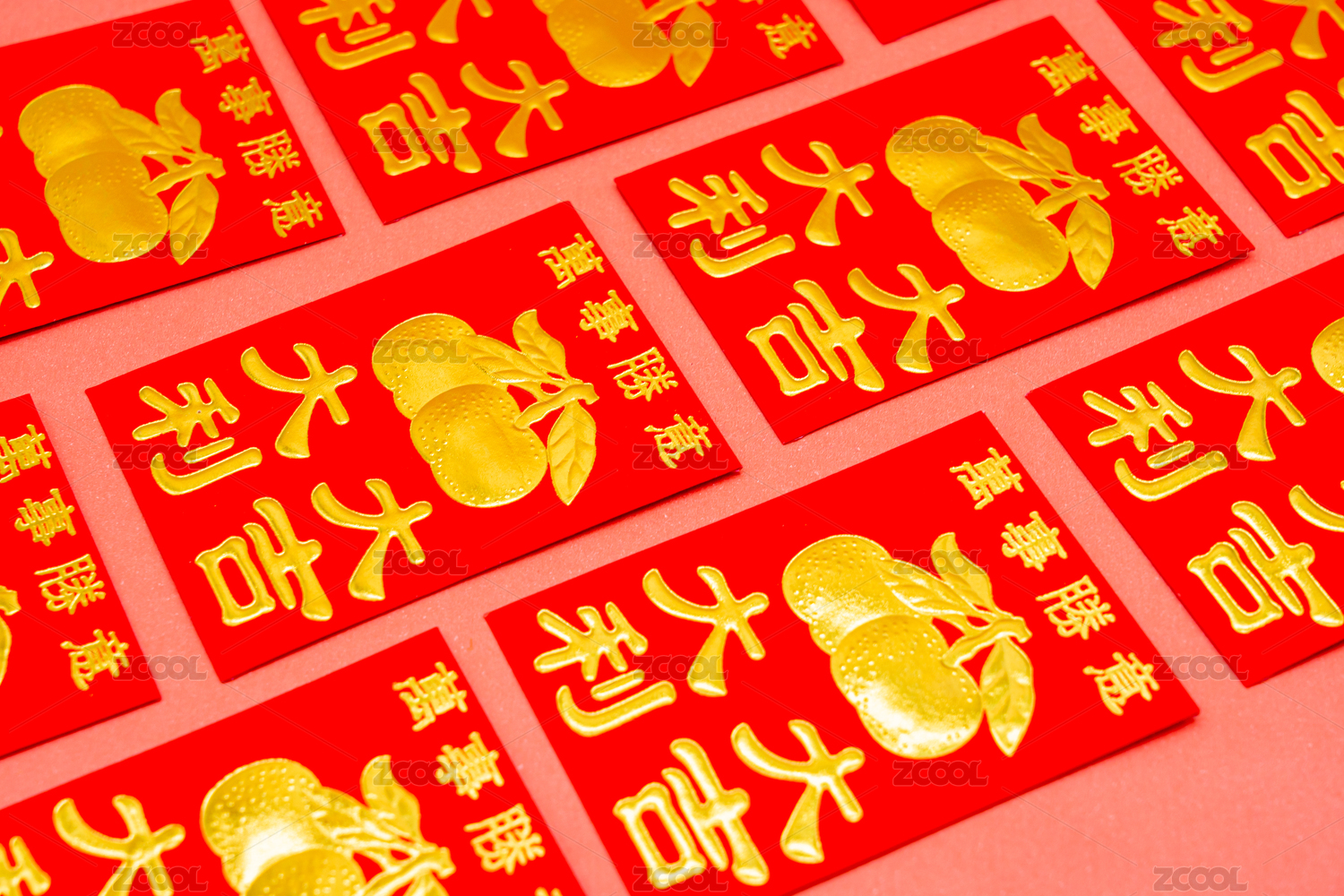 红色背景中排列整齐的春节新年红包