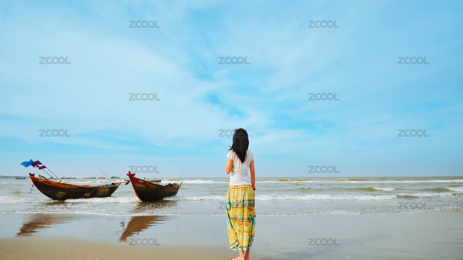 美丽气质女孩在游轮上面对蓝色大海的夕阳