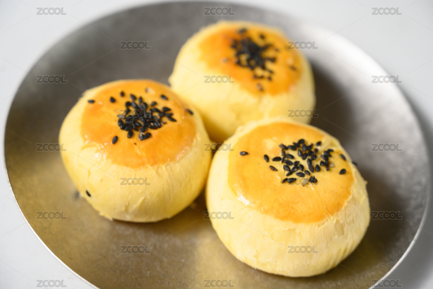 圆圆的黄色酥饼在黄金的多个蛋黄流心酥中间