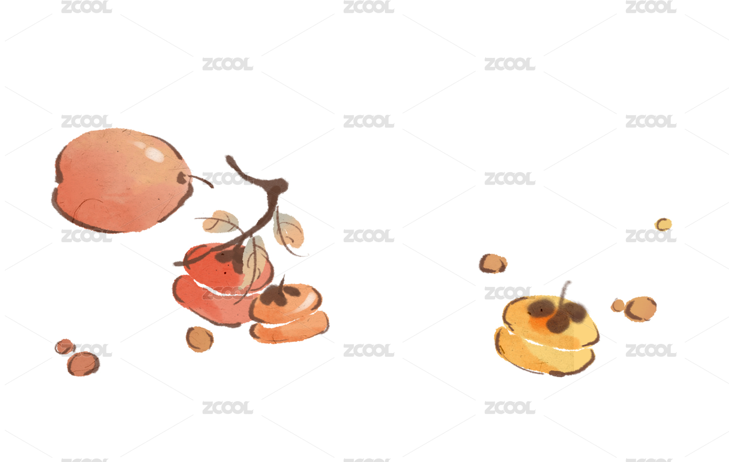 新中式吉祥风柿子花生蔬果插画