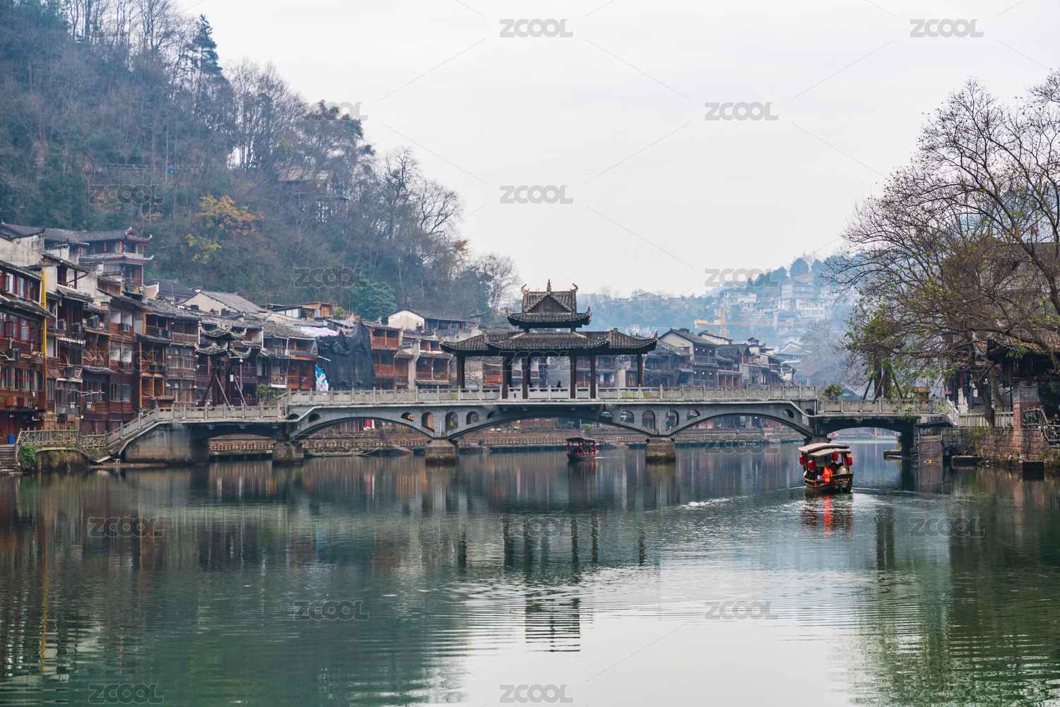 中国湖南湘西凤凰古城南华大桥和雪桥沿岸风光