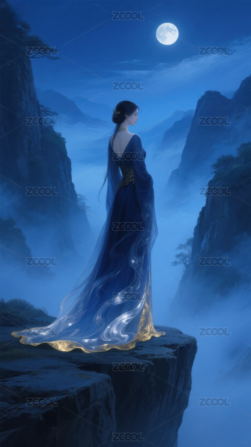 月下女子立于悬崖