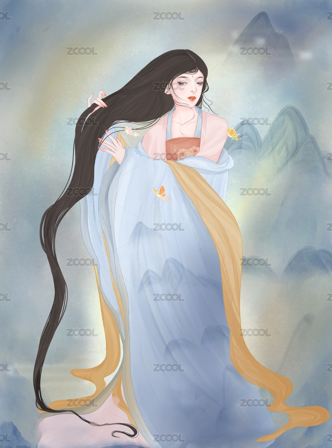 古风,国风,岩彩,插画,姑娘