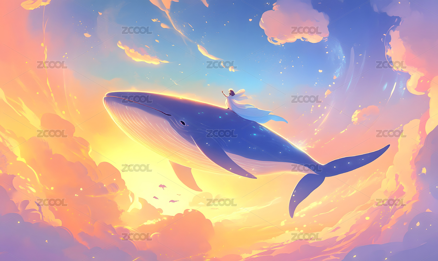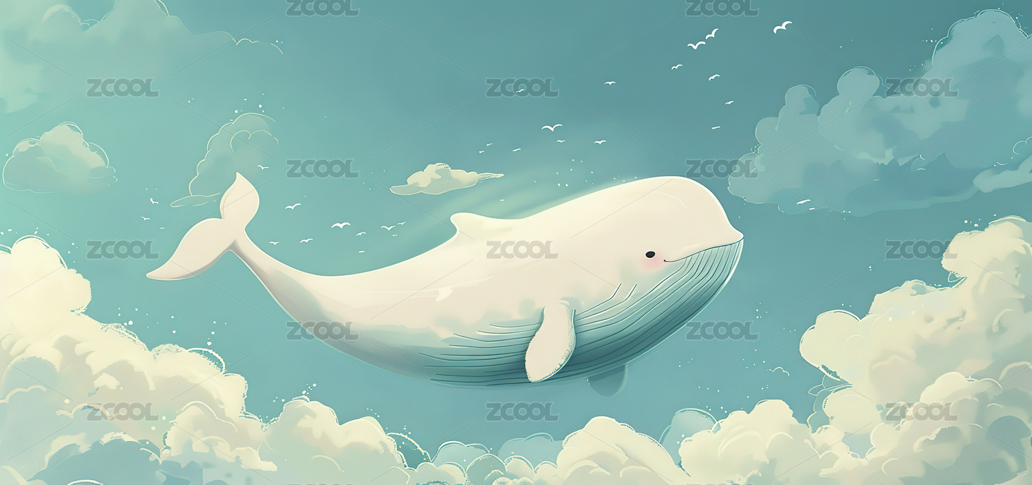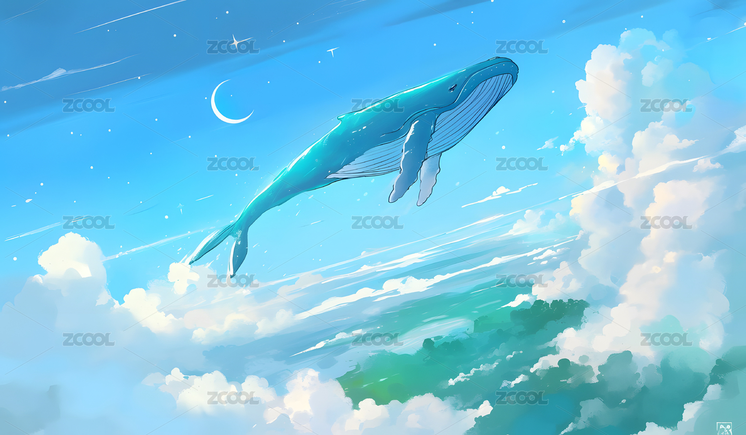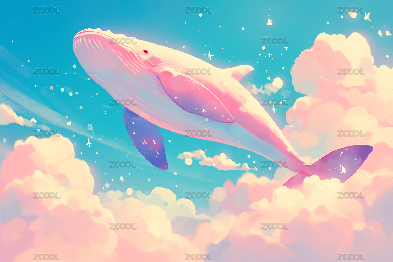 一只奇幻的卡通风格鲸鱼在明亮的蓝天中飞翔