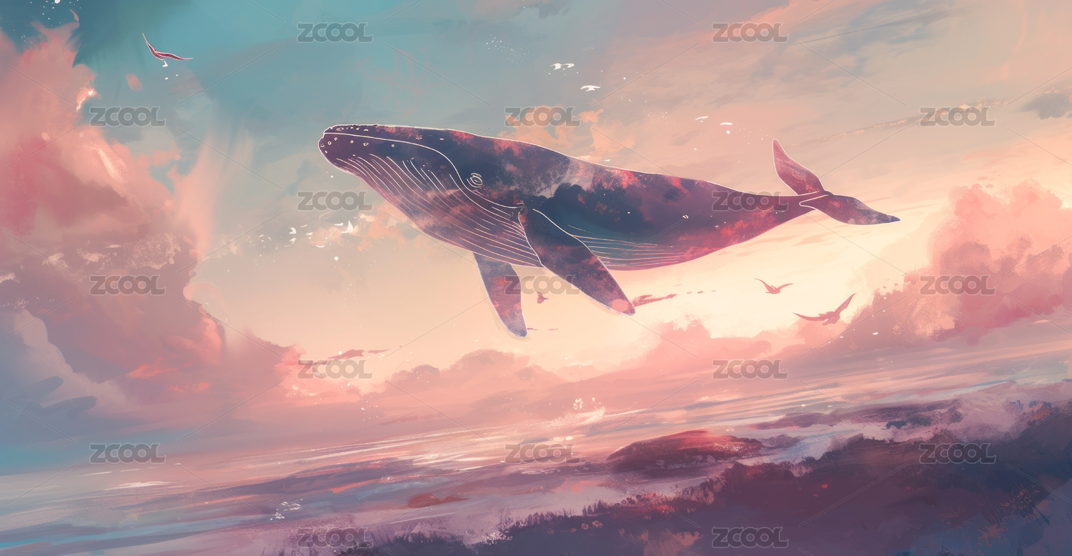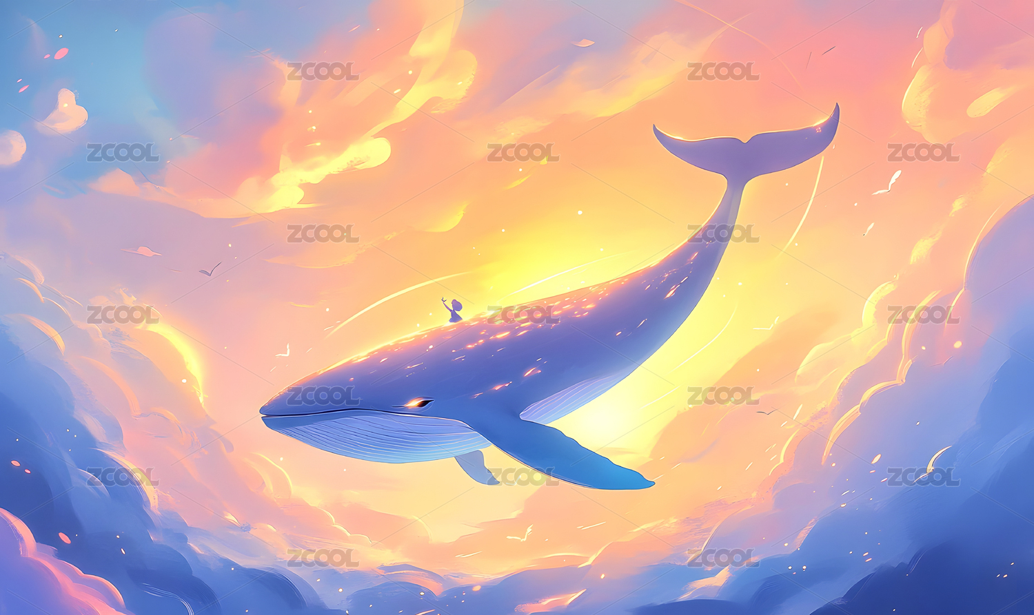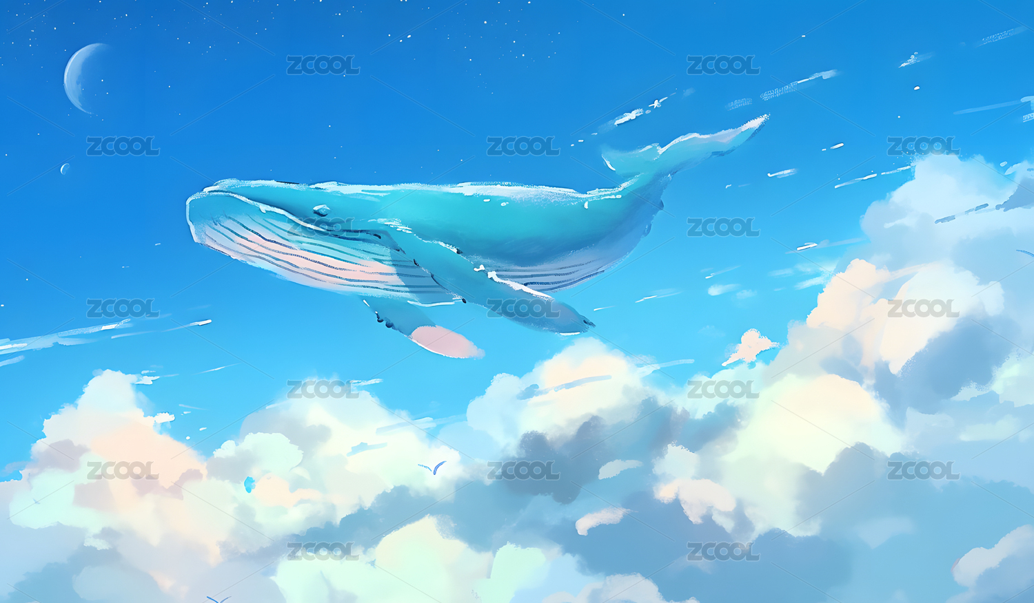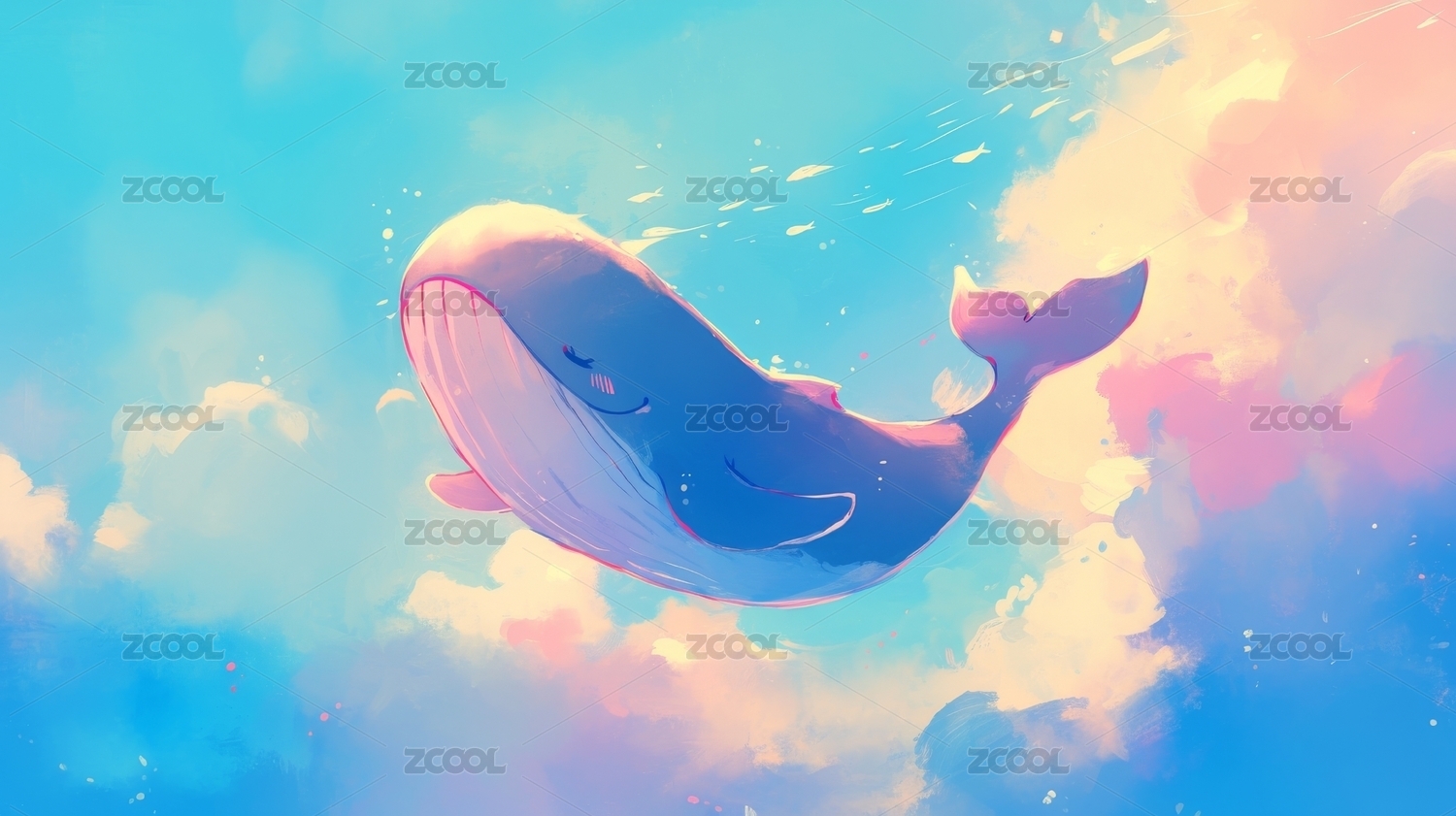 一只可爱的蓝鲸优雅地漂浮在梦幻的天空中
