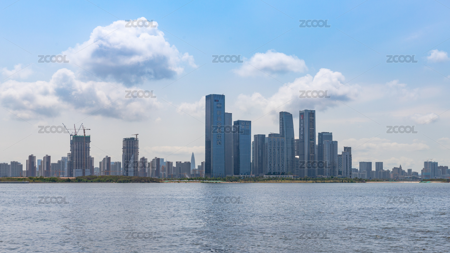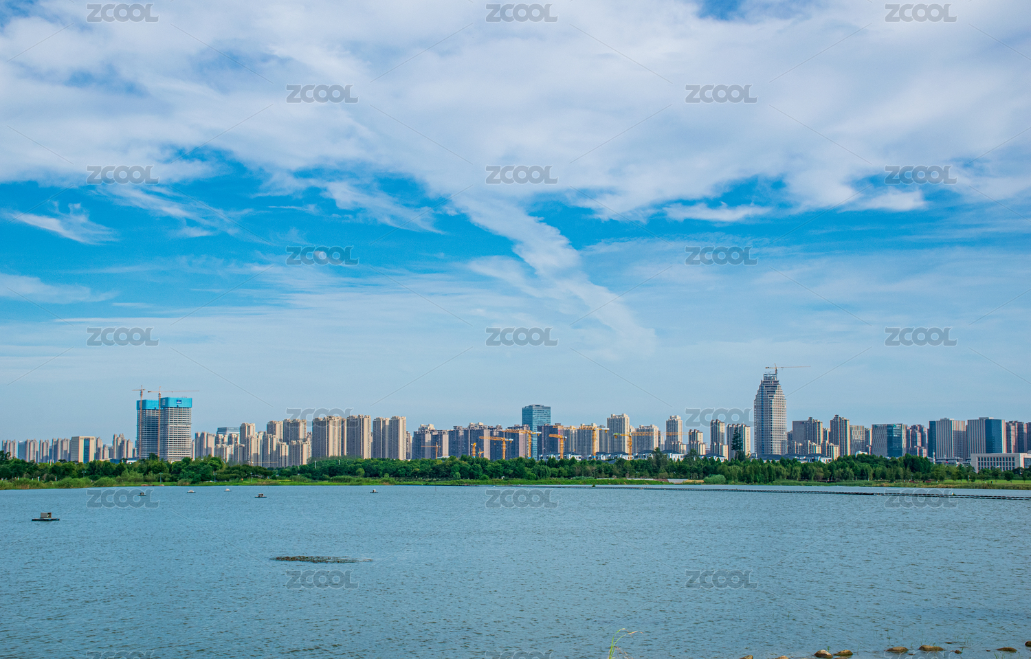 晴朗天空下,蓝色微波的湖水前远眺城市建筑