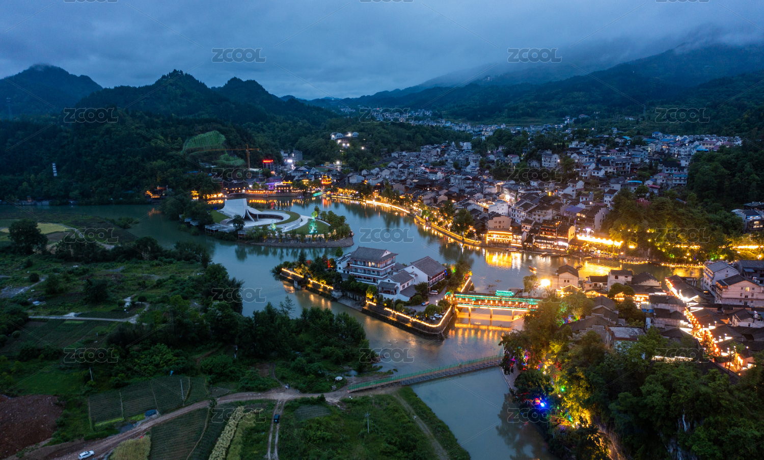 航拍中国浙江丽水傍晚时分的古堰画乡