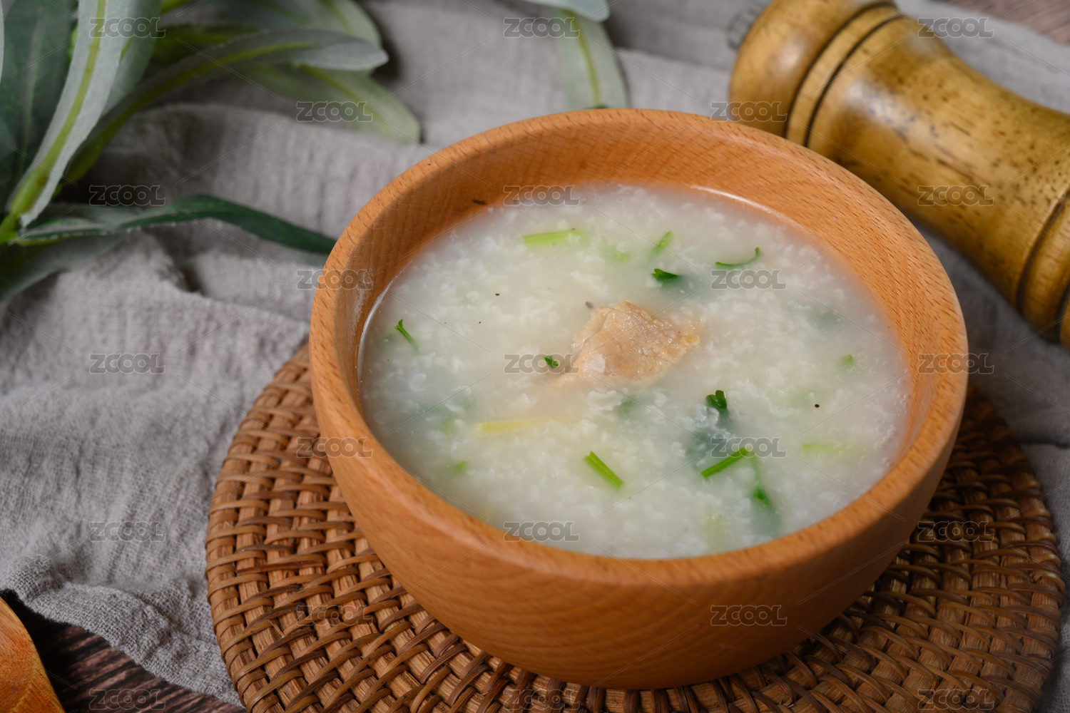 桌面上的碗里的美味可口的猪肉粥