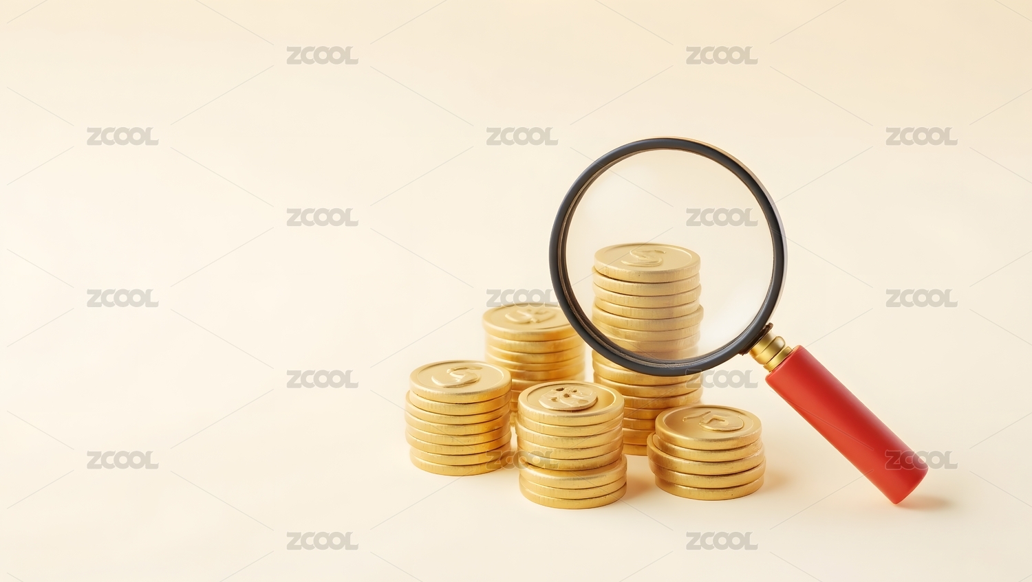 金融文件上的美元硬币和放大镜及一个微缩的小人