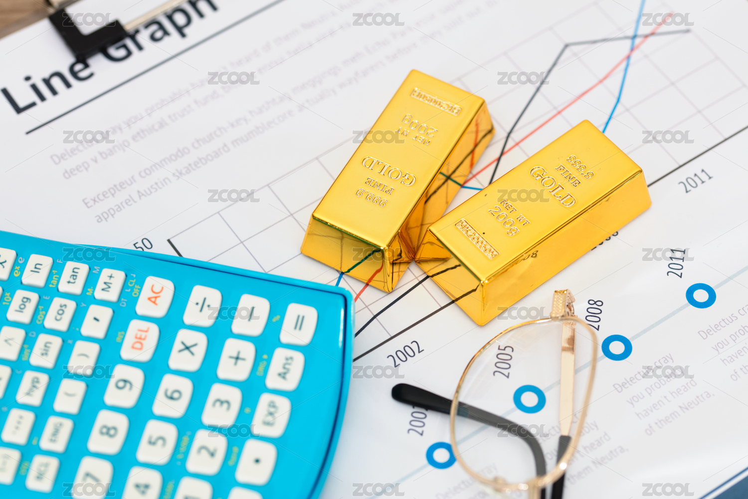 计算器和一堆金块在文件资料上