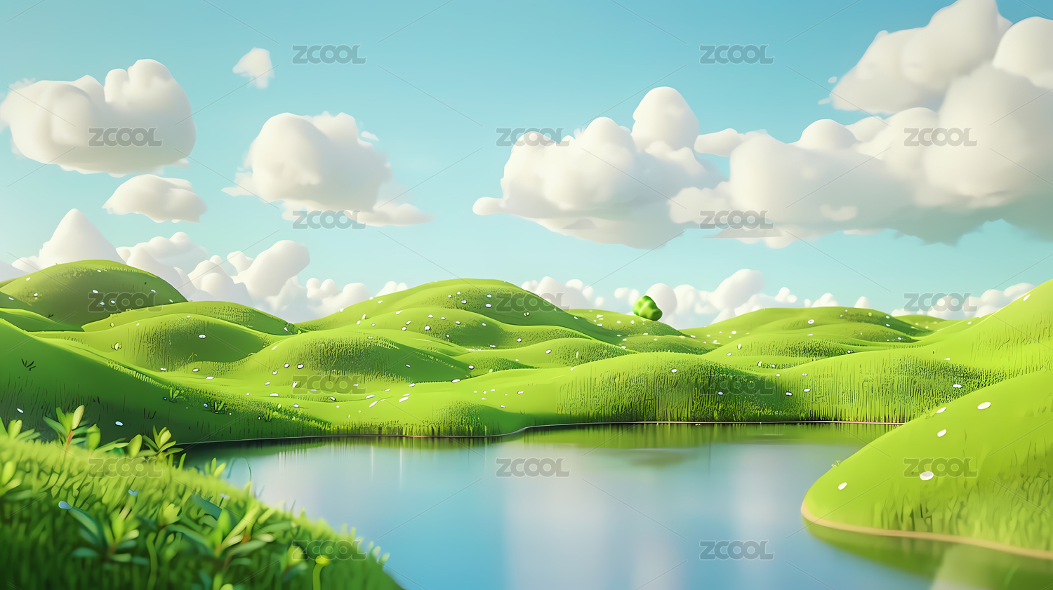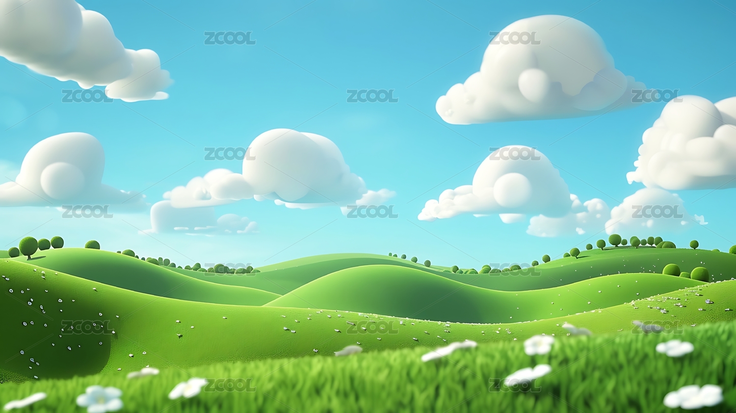 蓝天下的卡通绿色小山3D渲染
