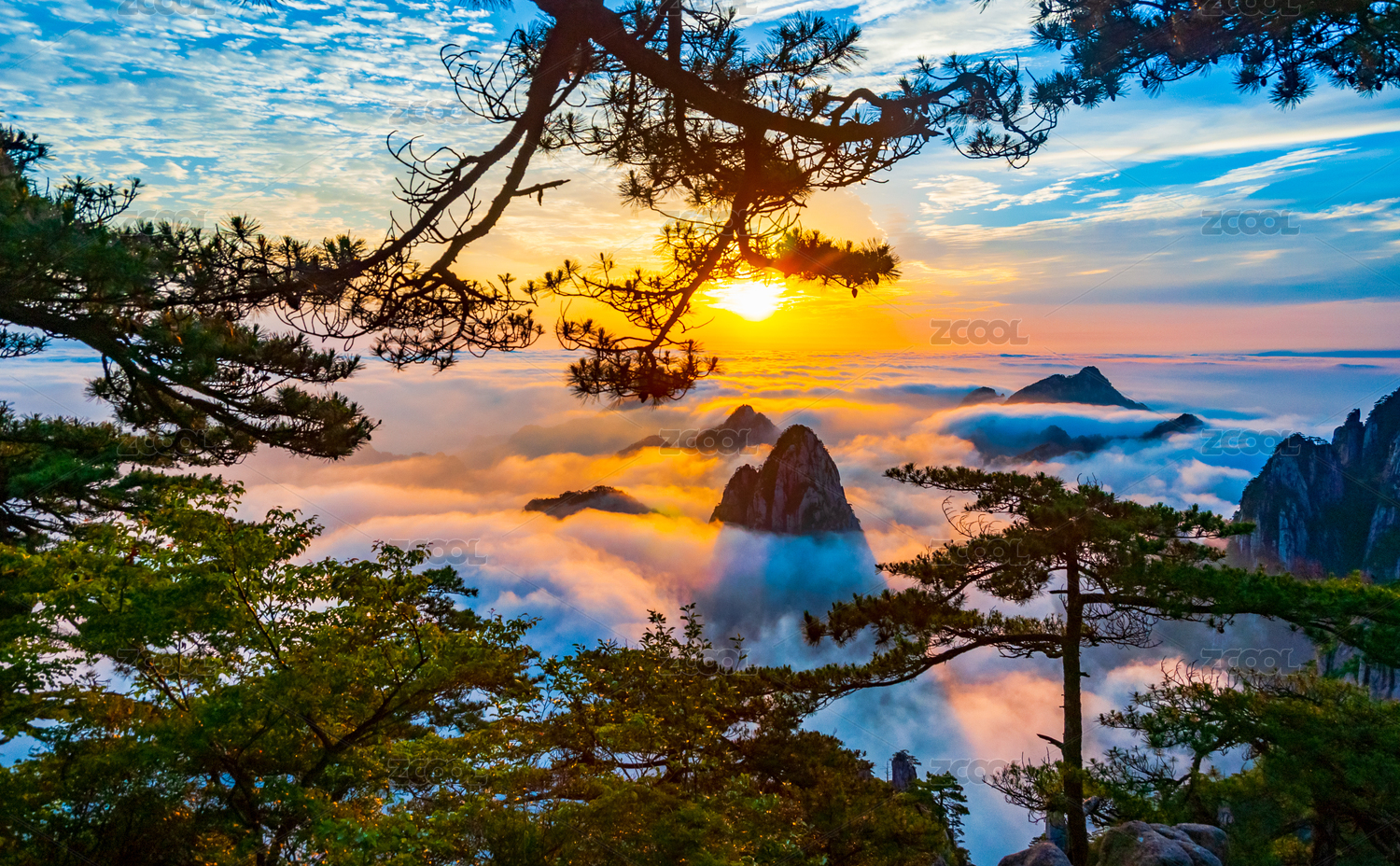黄山松树云海薄雾日出