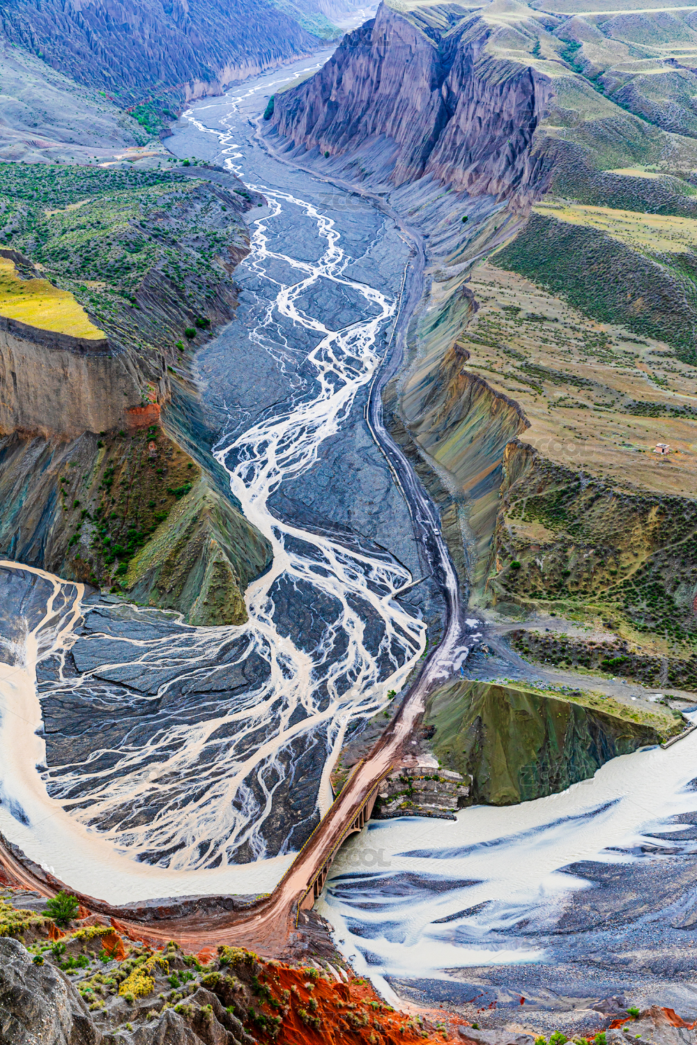 中国新疆安集海大峡谷底冲击成蜘蛛网形河流