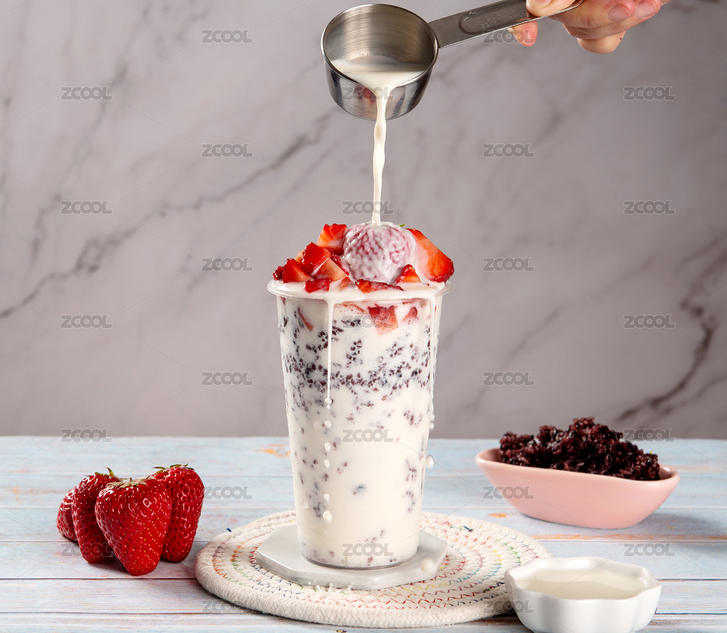 玻璃杯里的饮品饮料草莓奶盖冰茶草莓酸奶