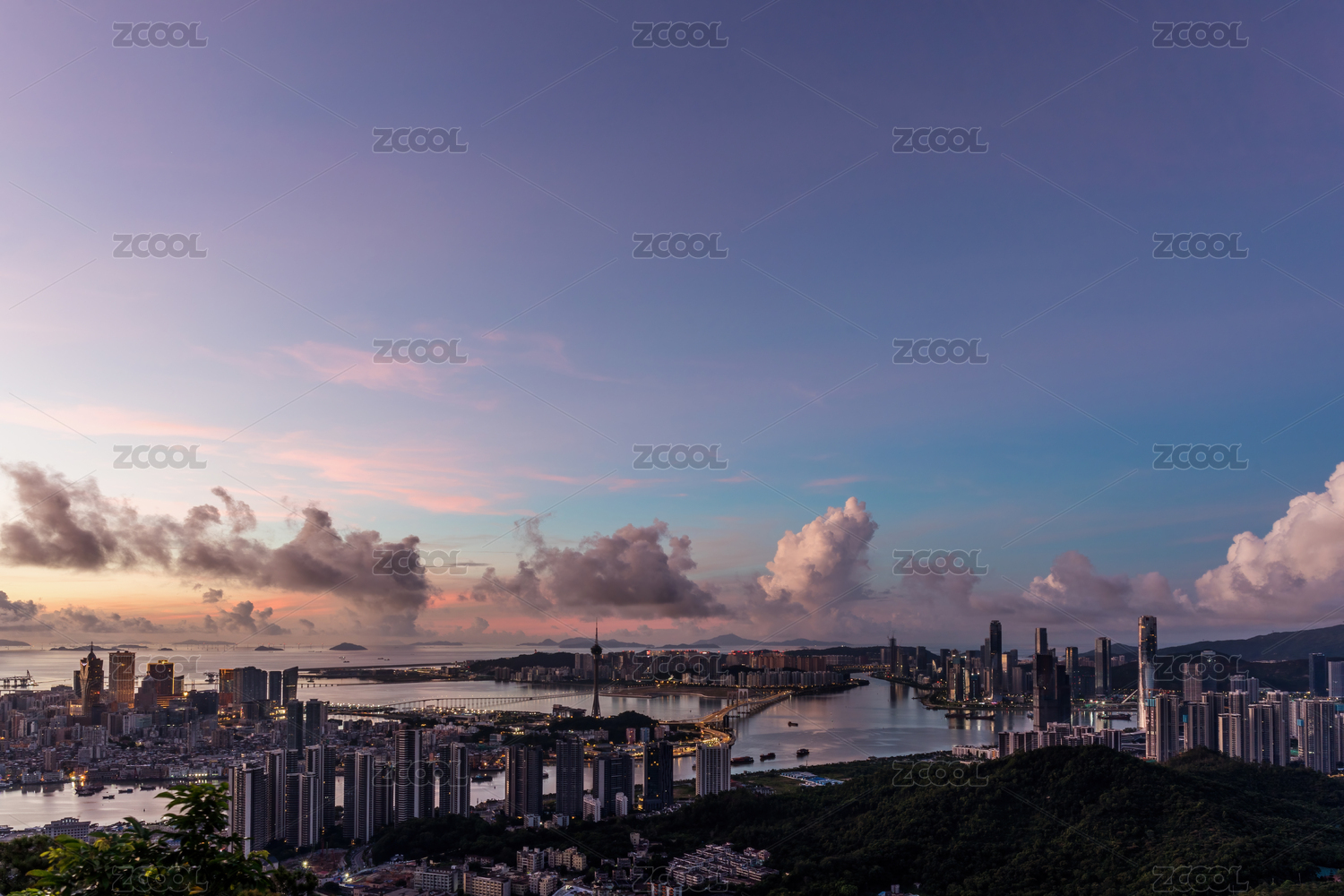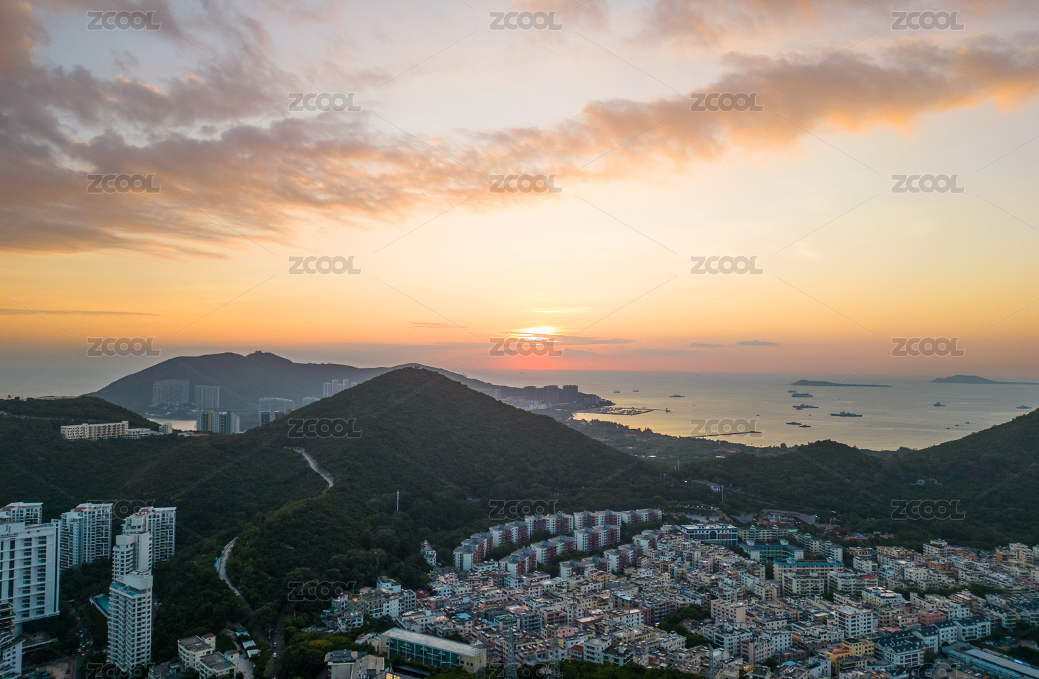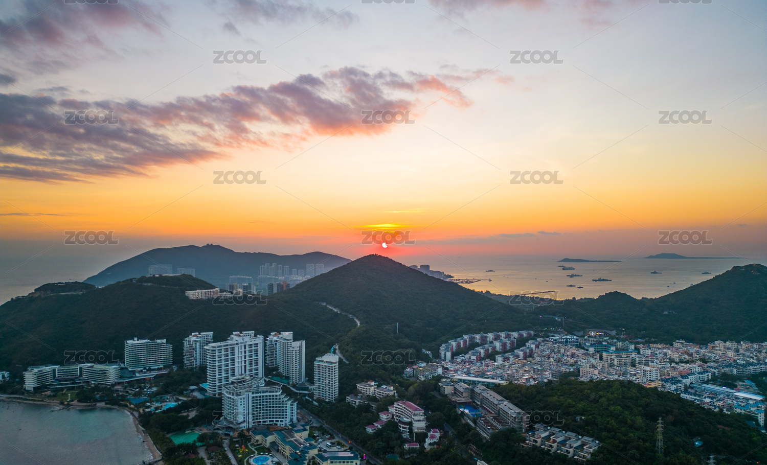 中国海南省三亚市鹿回头海湾都市夕阳晚霞景观
