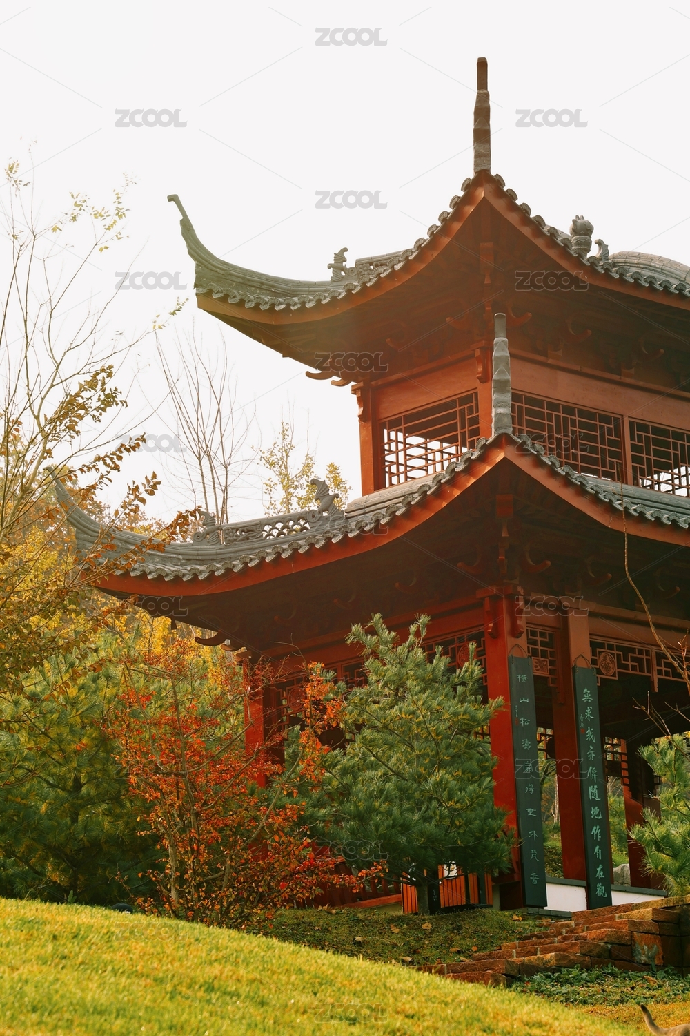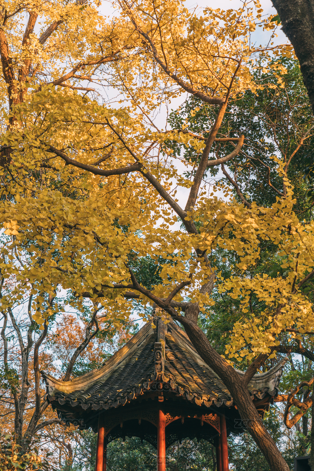 上海嘉定小河口公园的枫叶古亭秋色景观
