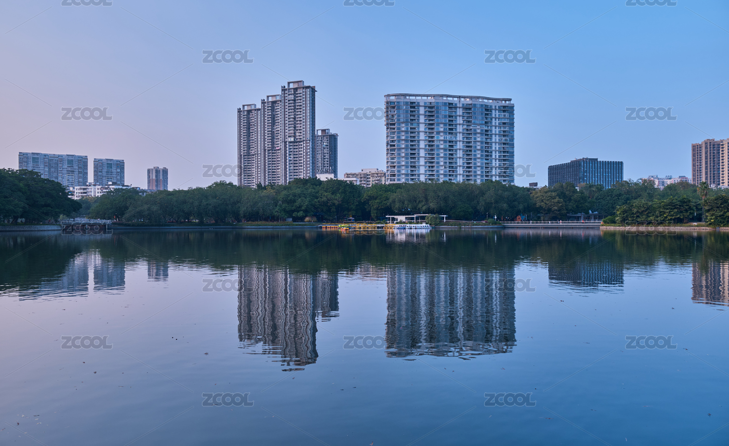 南宁南湖公园夕阳黄昏与城市摩天大楼建筑