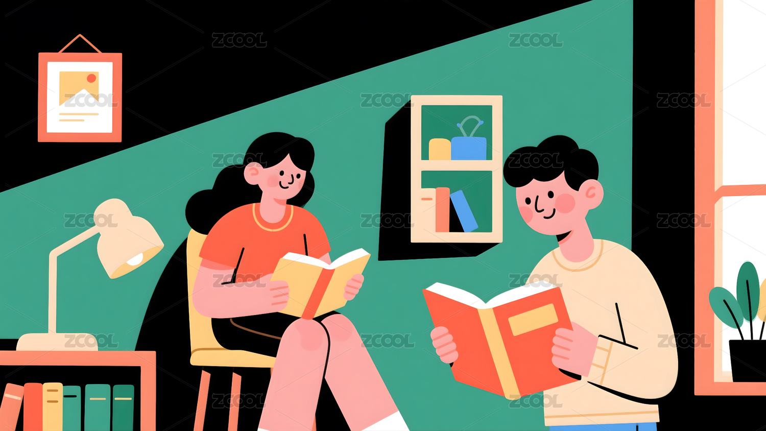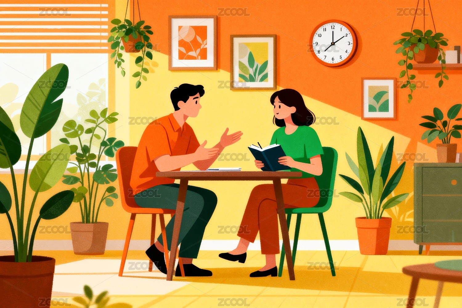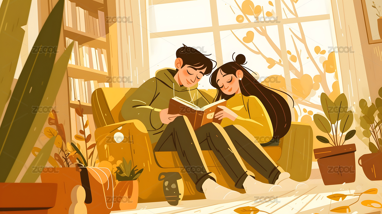 一个女生抱腿坐在地毯上望向远方思考旁边有琴叶榕和书,暖色调插画