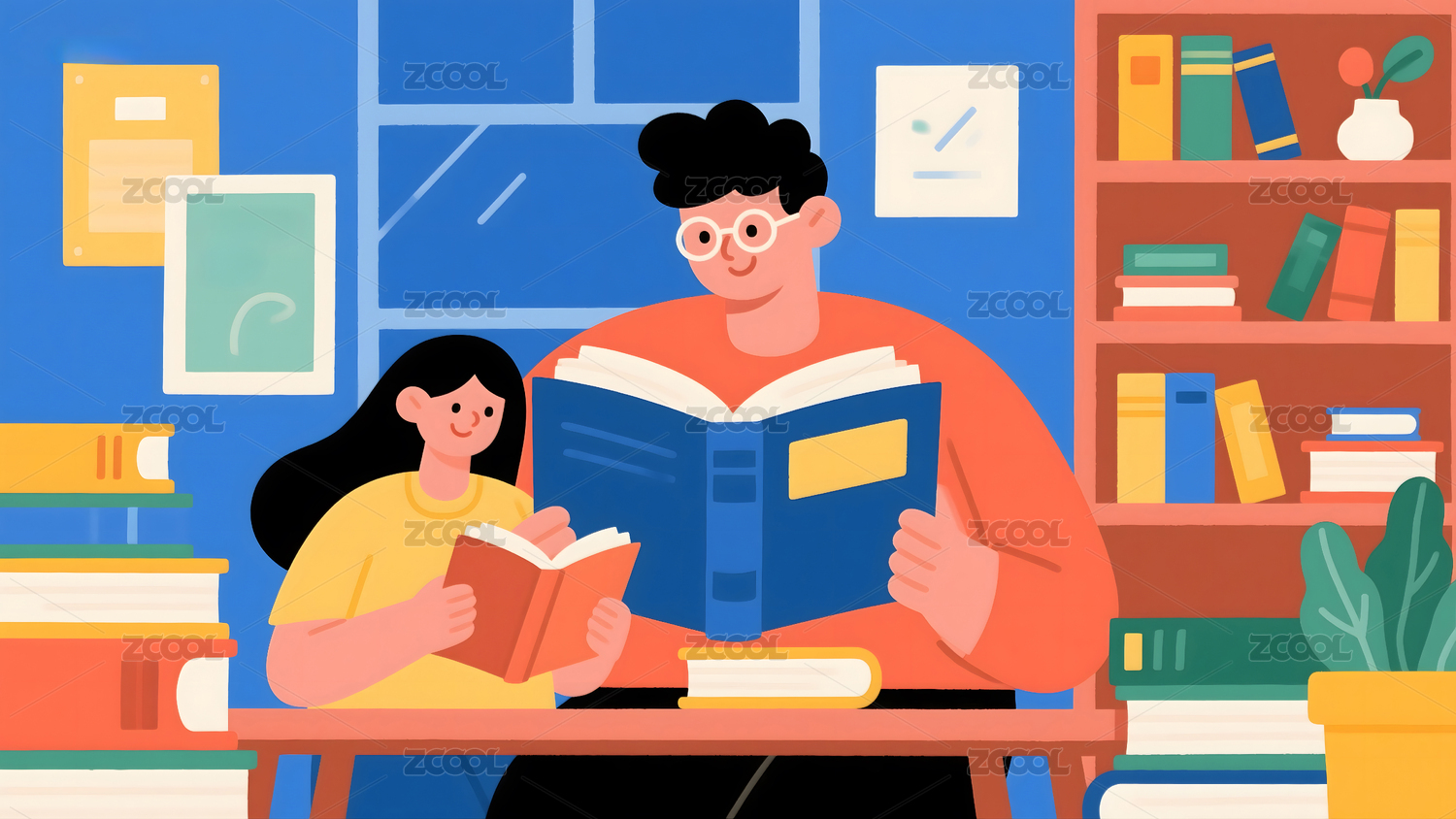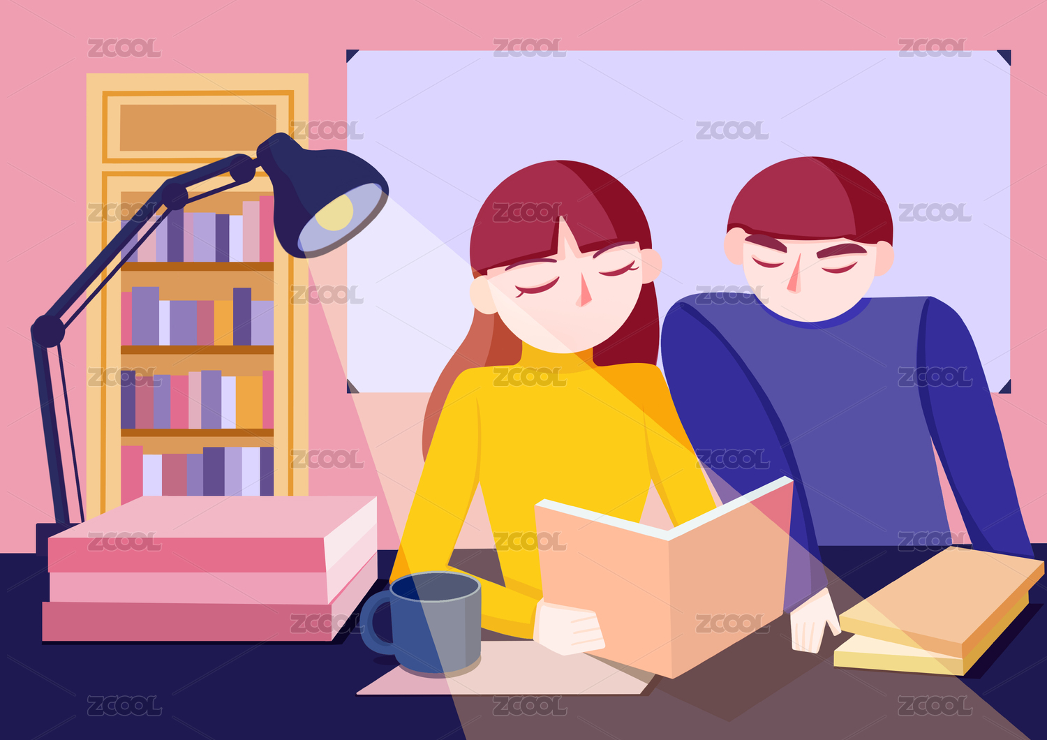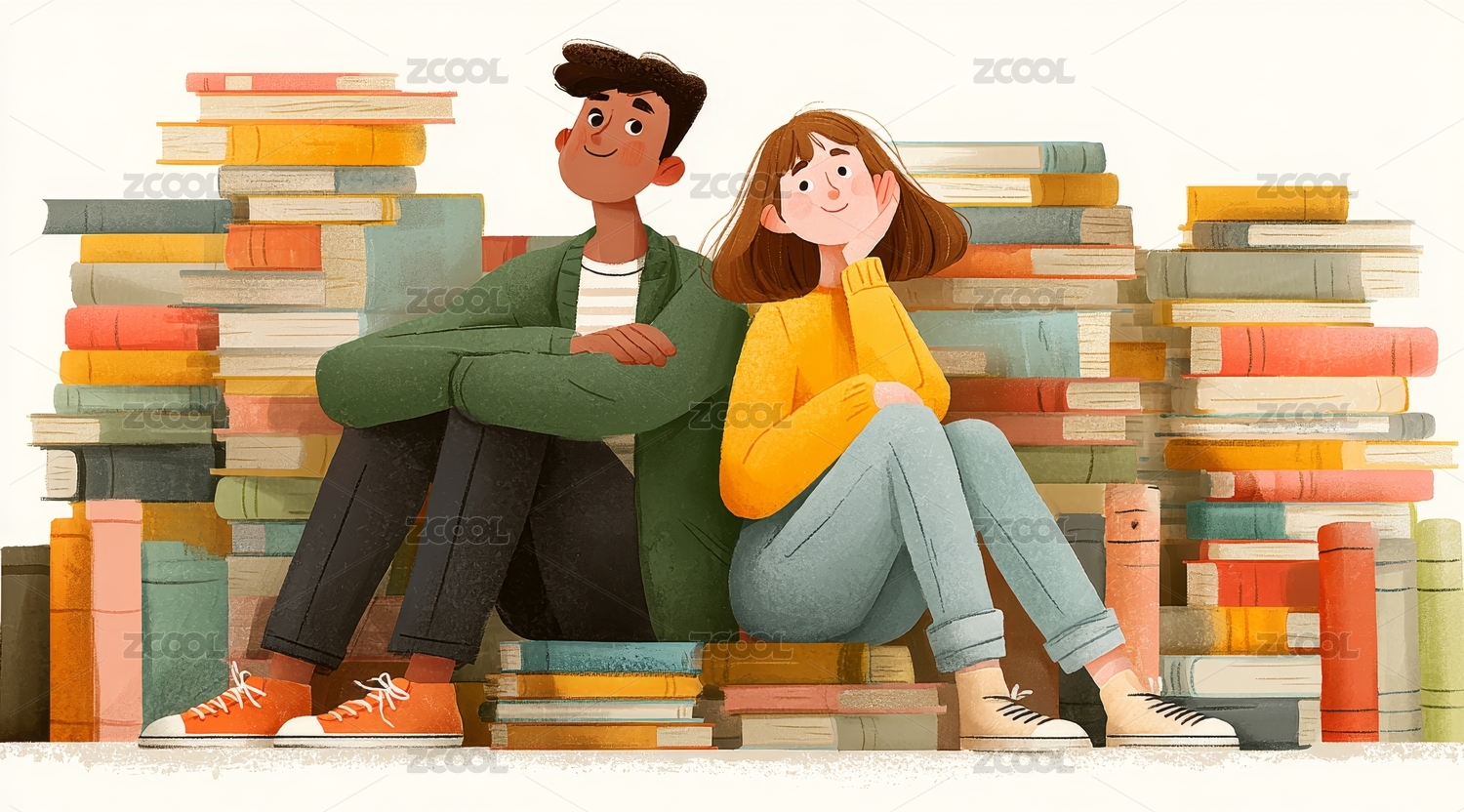 一个女生抱腿坐在地毯上望向远方思考旁边有琴叶榕和书,暖色调插画