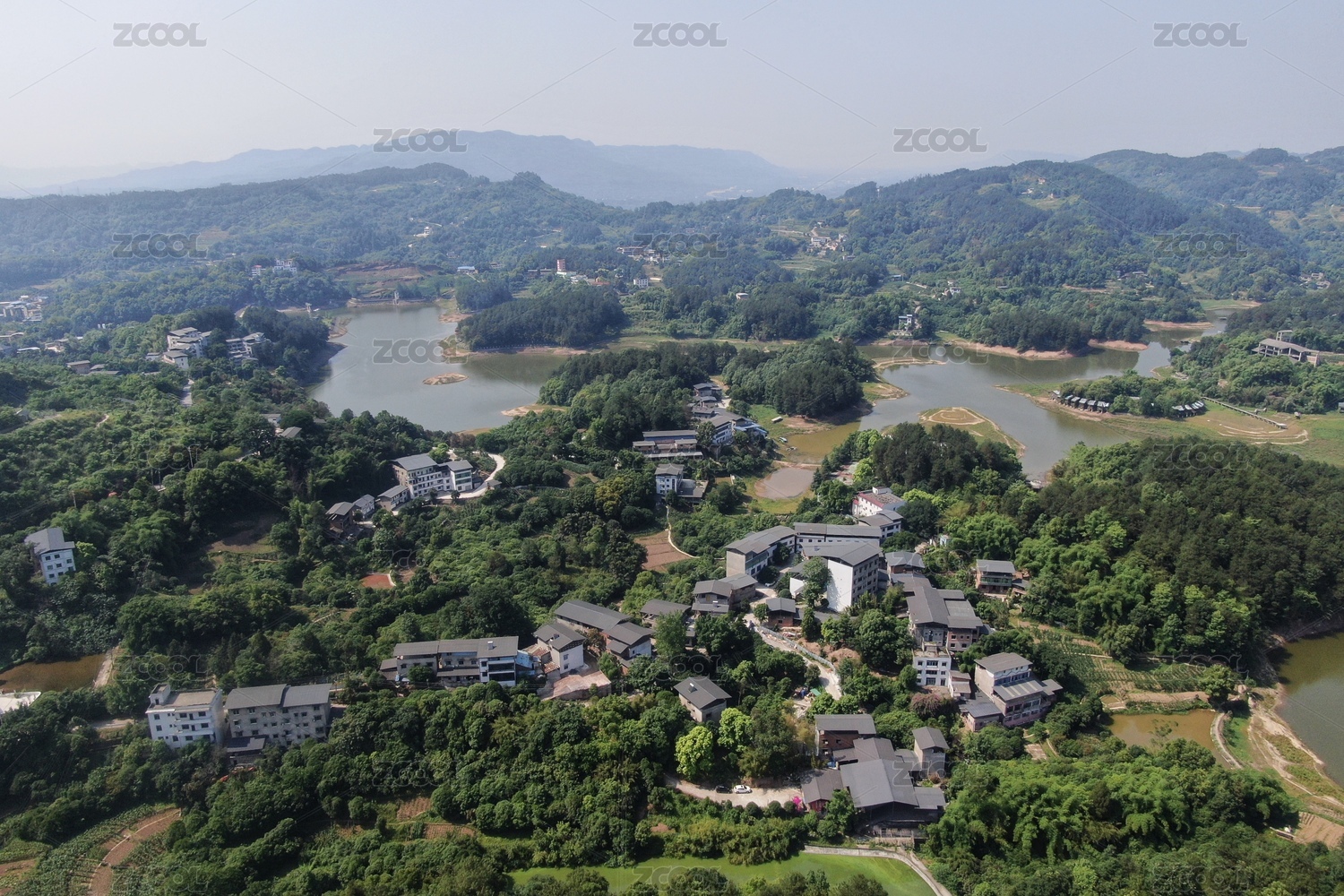 航拍湖南岳阳铁山水库中的小岛与村庄