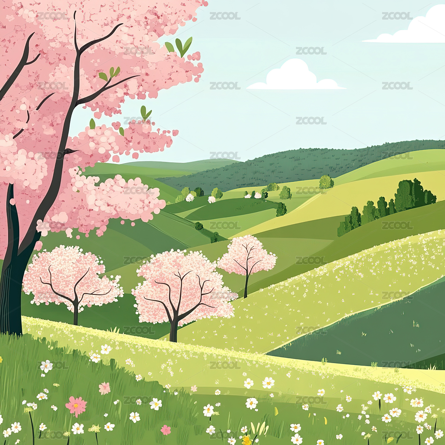 插画,自然,户外,卡通,草地,夏天,樱花,绿色,草,环境