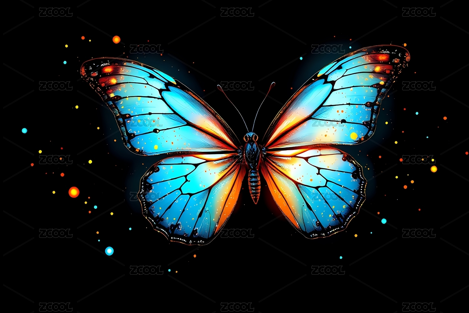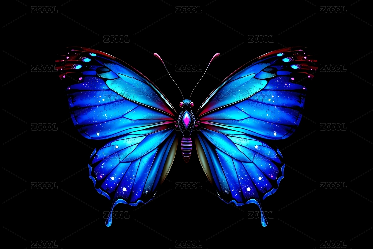 黑色背景上的绚丽蓝色梦幻蝴蝶