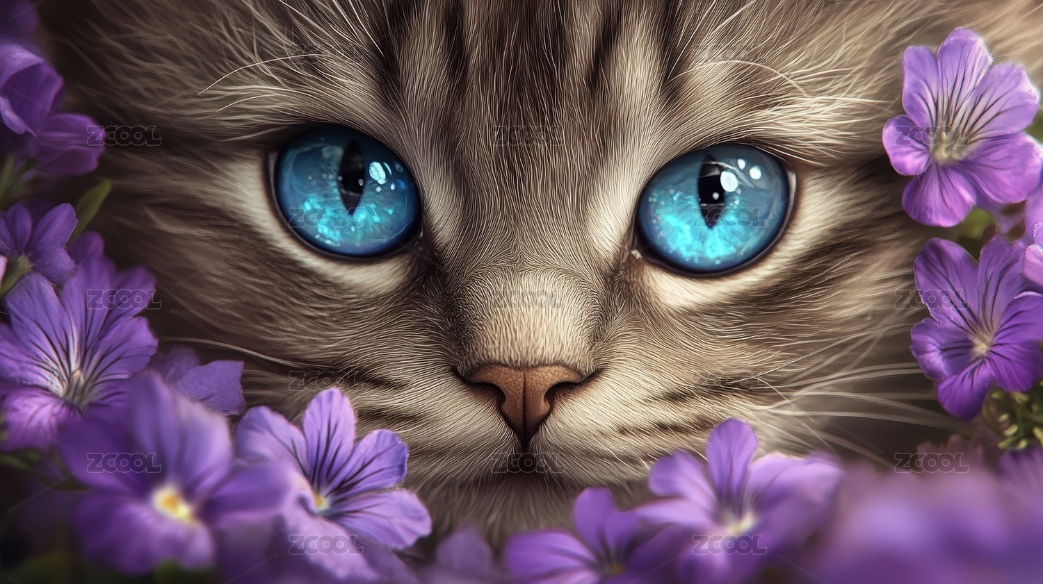 宁静,神秘,美丽,精致,优雅,猫咪,蓝眼睛,紫花,可爱,宠物