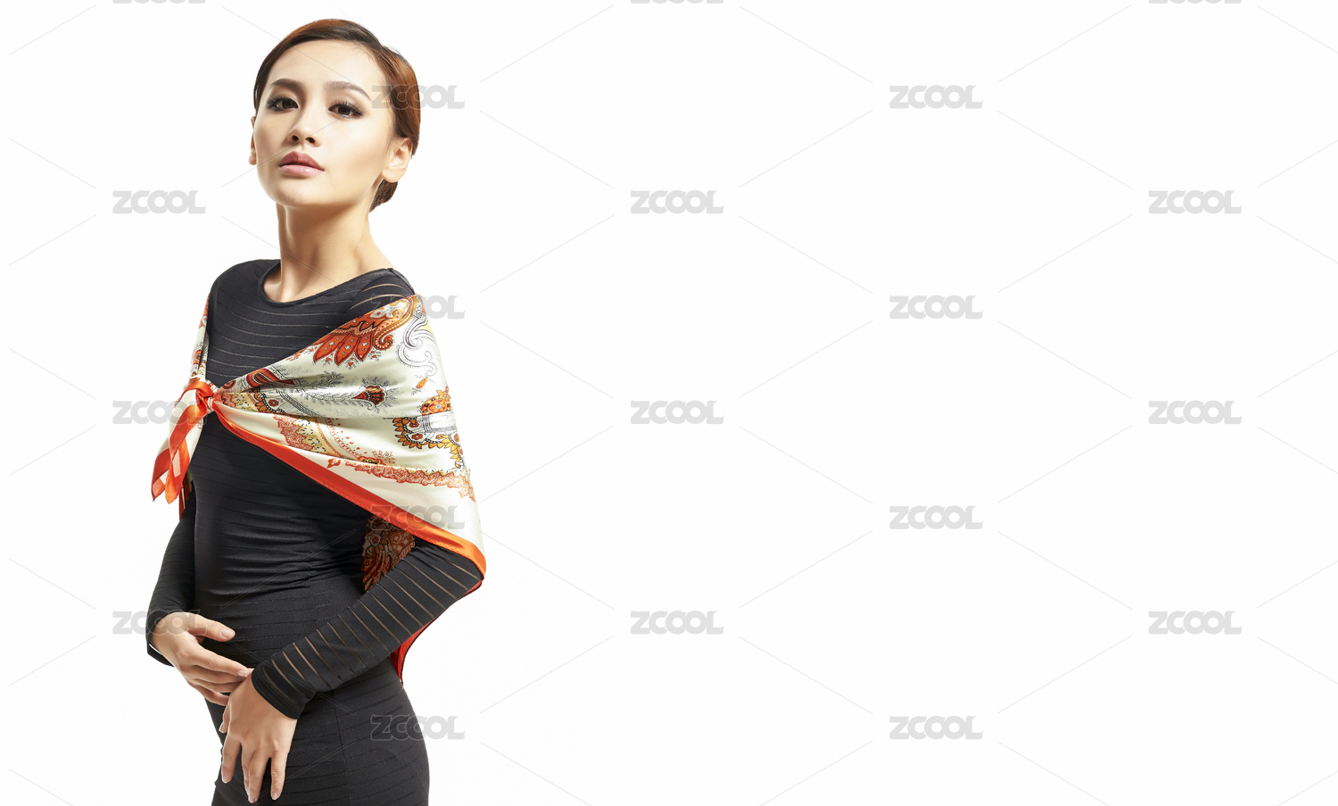 美丽的亚洲女孩披着黄色丝巾的白底图