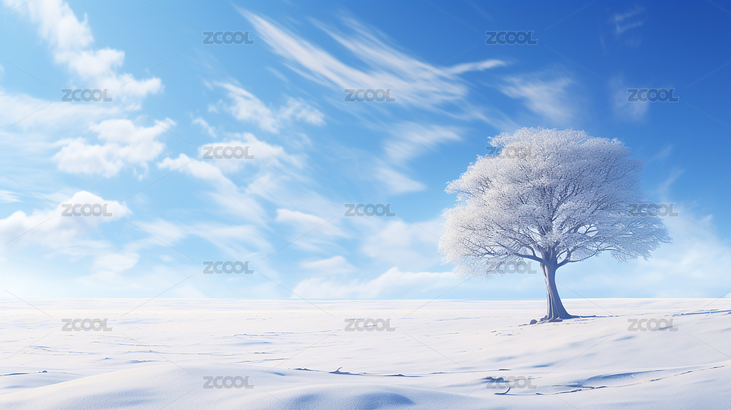 一棵孤独的树矗立在覆盖着厚厚积雪的地面上