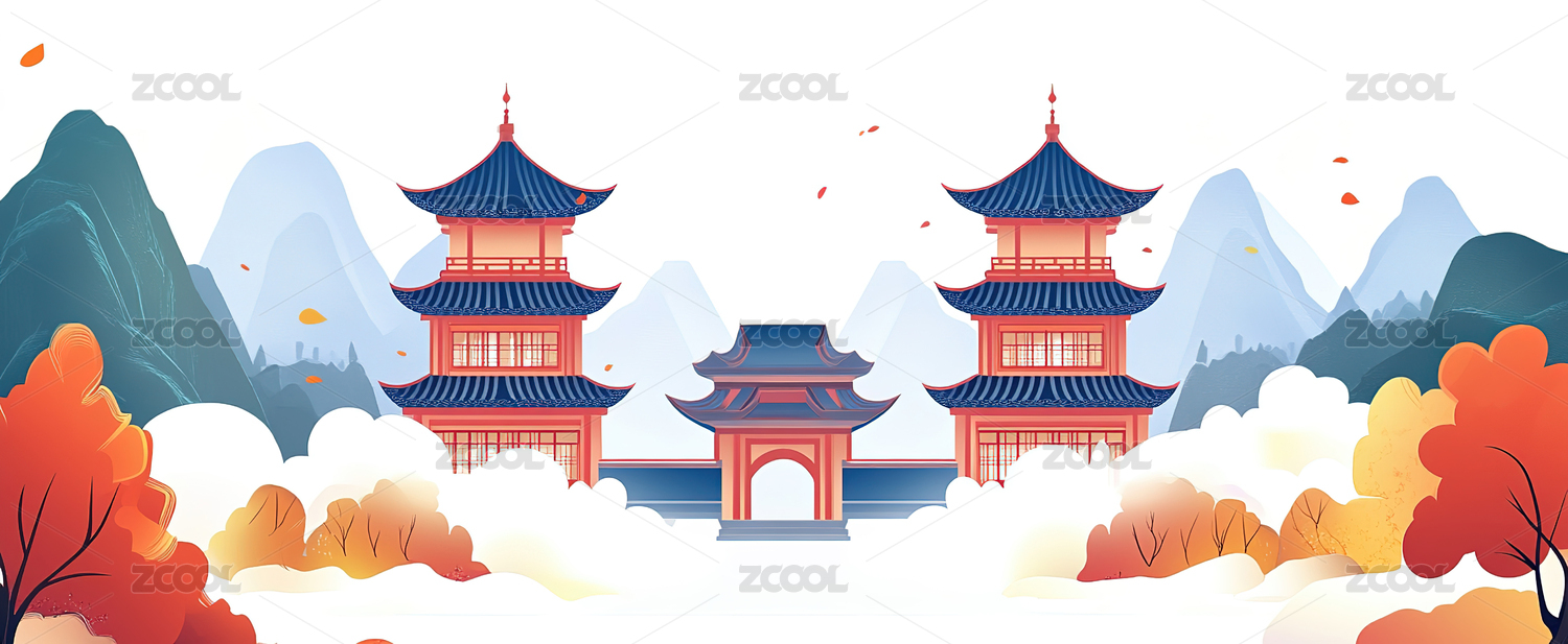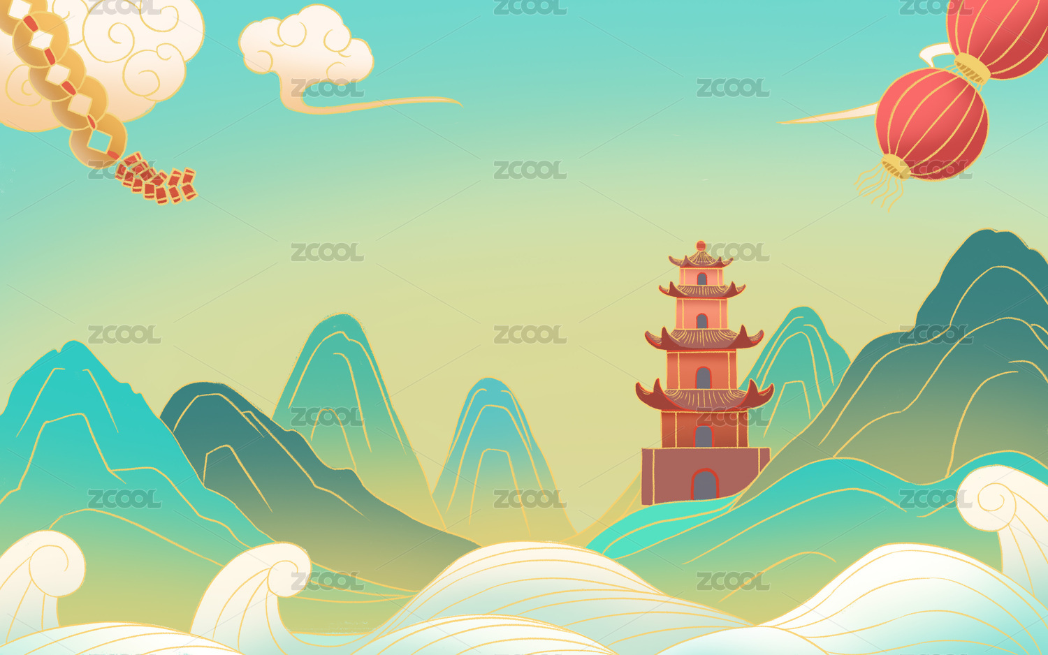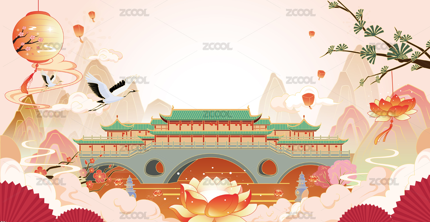 国潮锦鲤插画中国风山水鲤鱼风景活动海报