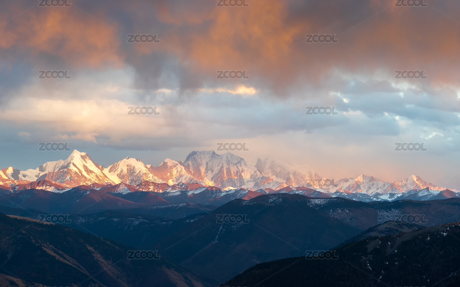 青绕神山和贡嘎山脉傍晚时分的日照金山