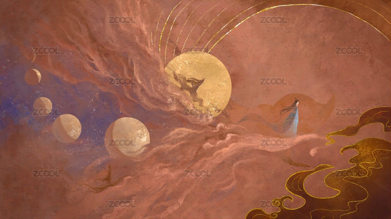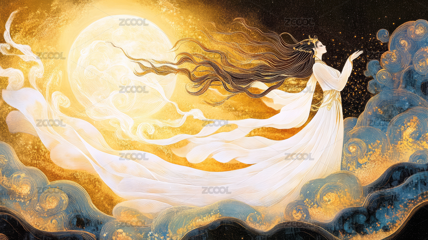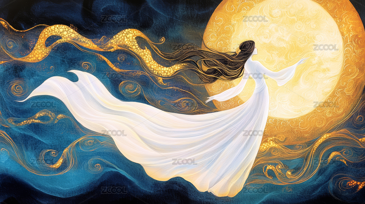 金色圆月与白衣仙女插画背景