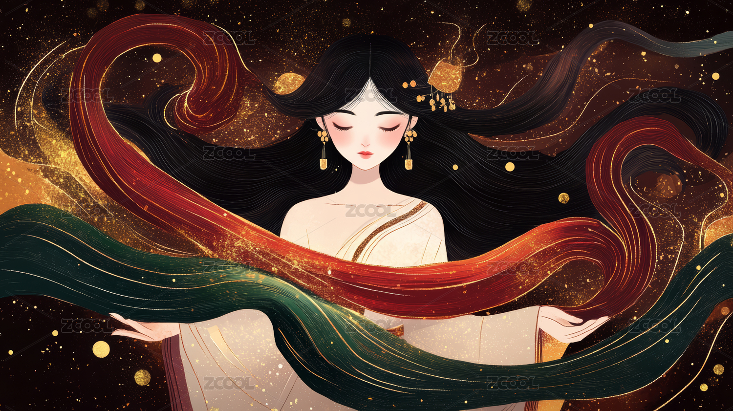 抽象线条金色长发女人黑色背景