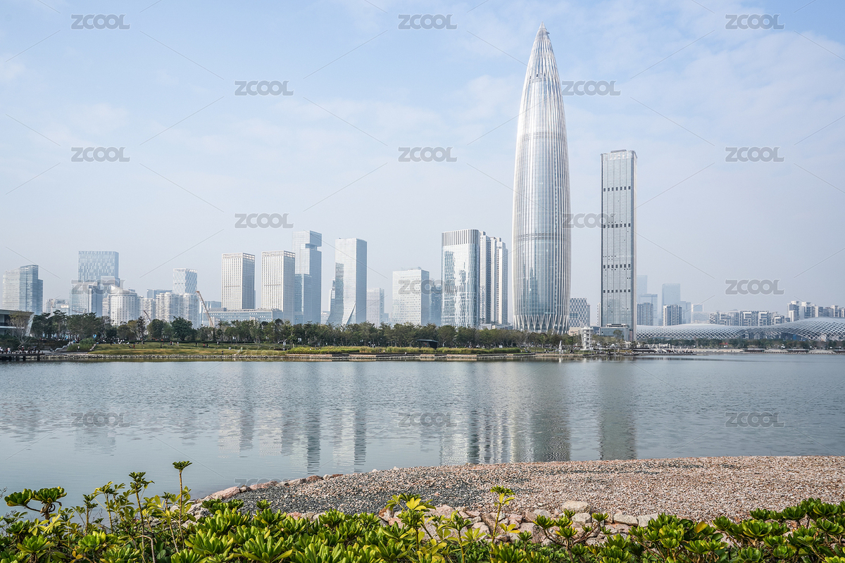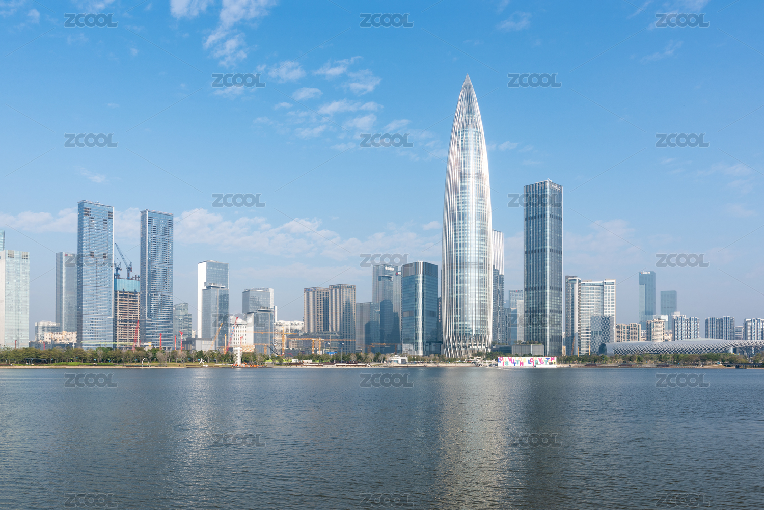 摩天大楼,大都市区,天空,水,白天,天际线,全景,深圳湾,中国,深圳
