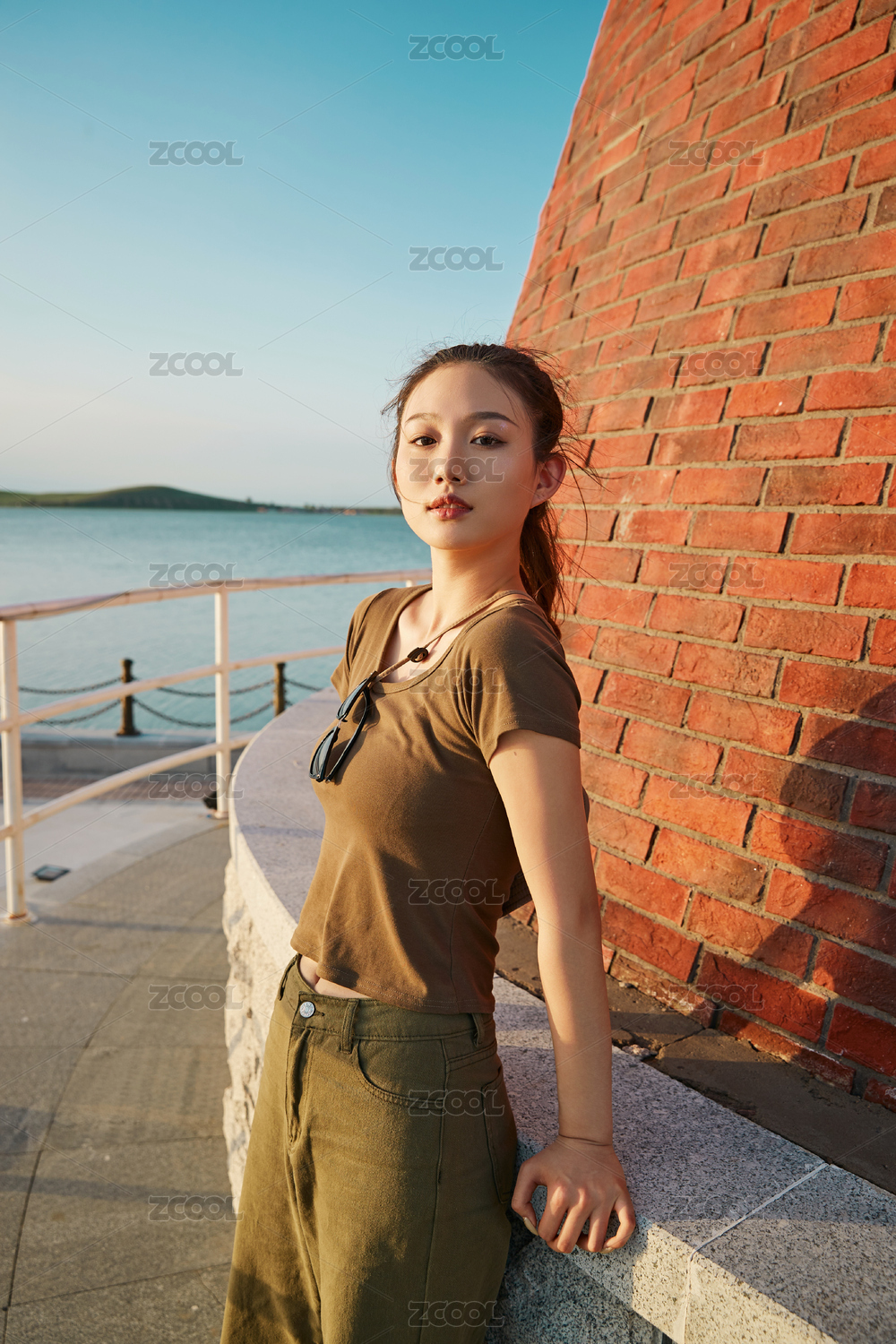 盛夏夕阳晚霞湖边码头灯塔上的少女