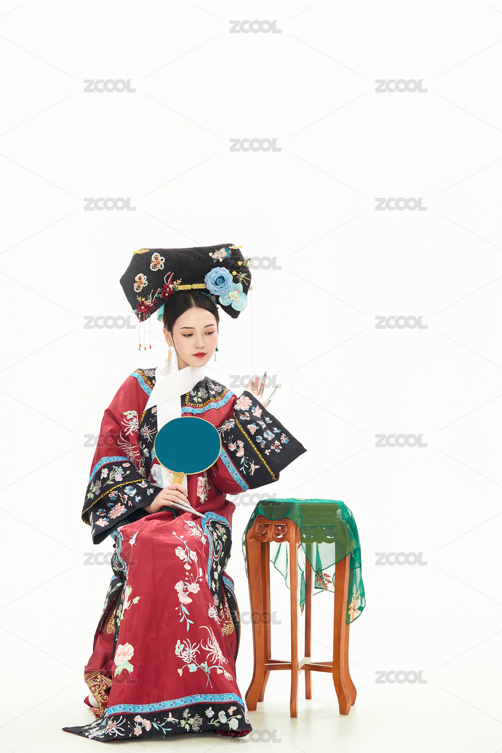 白色背景下穿着中国清朝宫廷服饰的少女