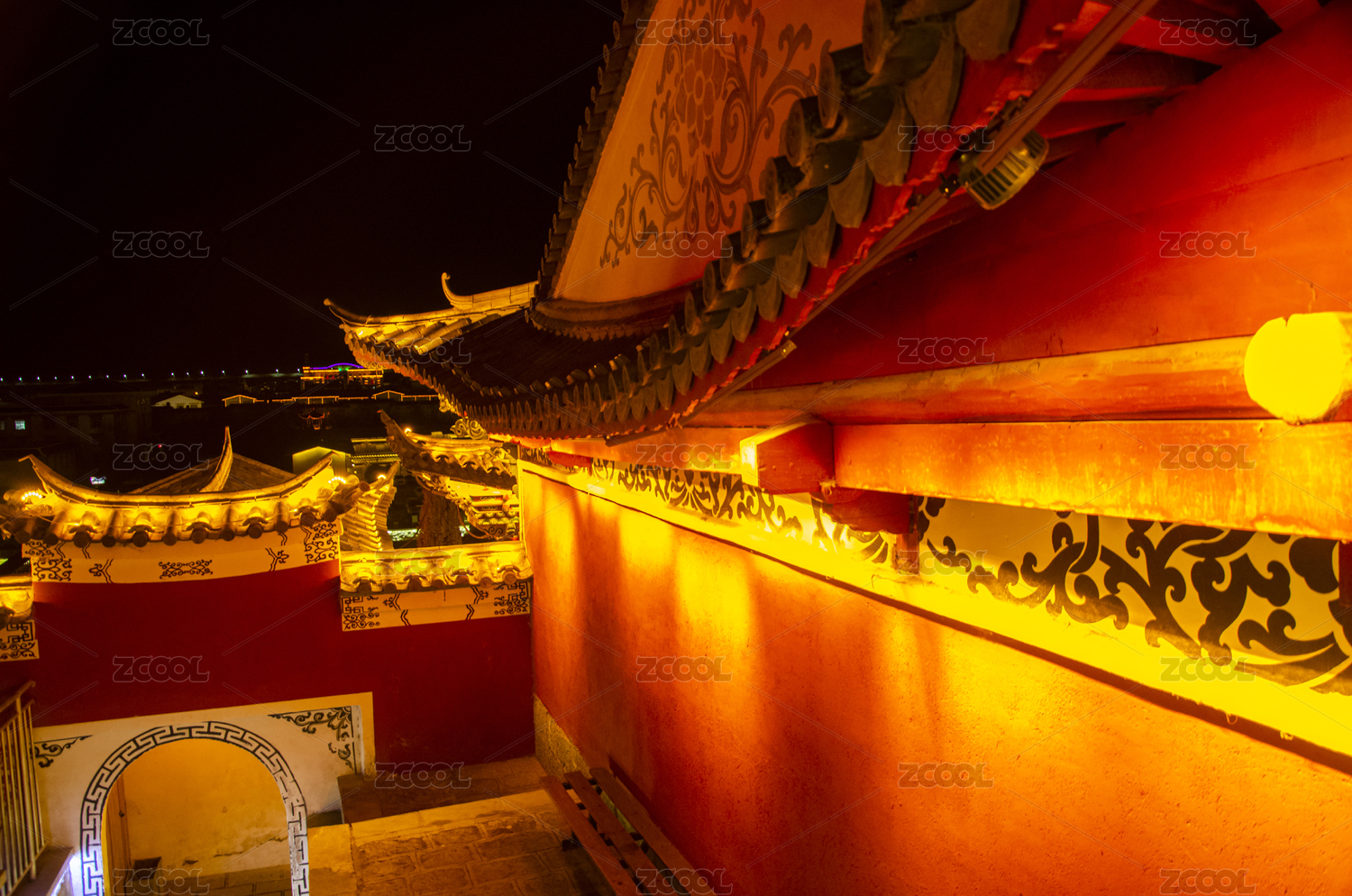 夜晚暖色光线环境中的仿古建筑