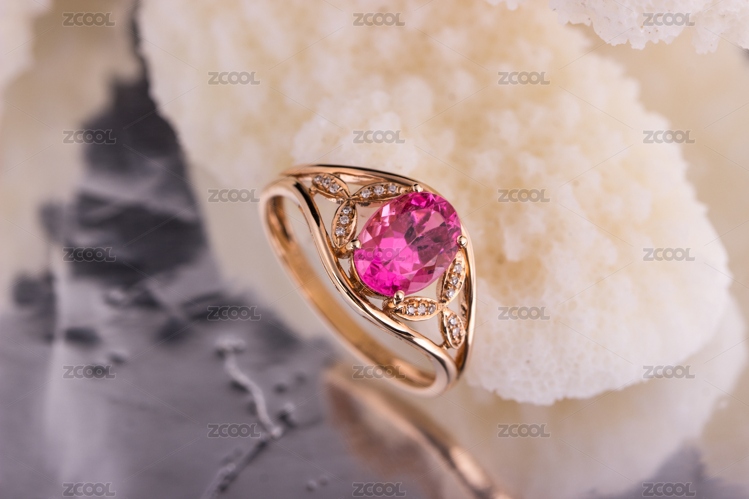 彩色宝石钻戒放在带有白色珊瑚的背景里