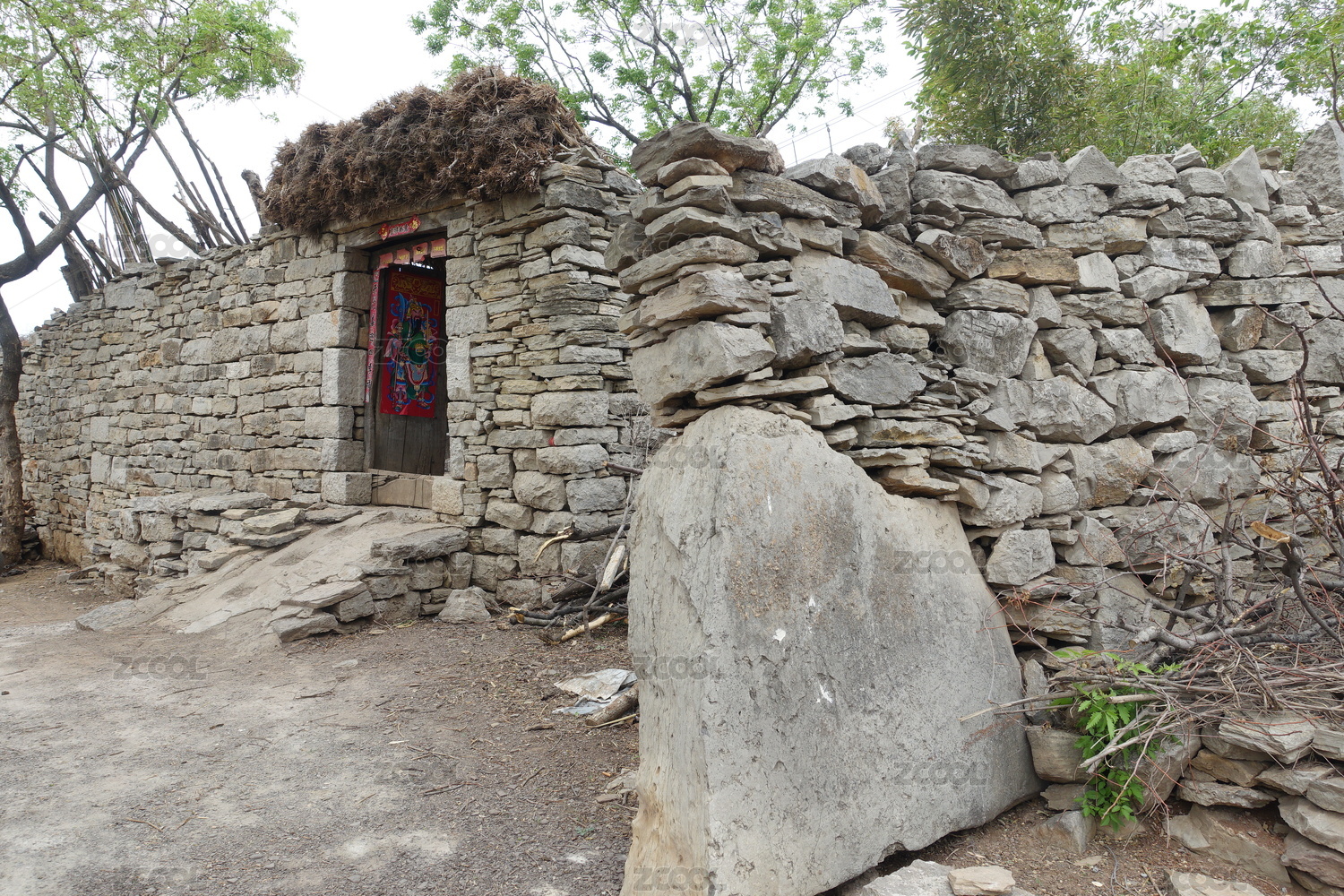 中国山东省临沂市沂南县沂蒙山村石墙院落茅草门罩式院门