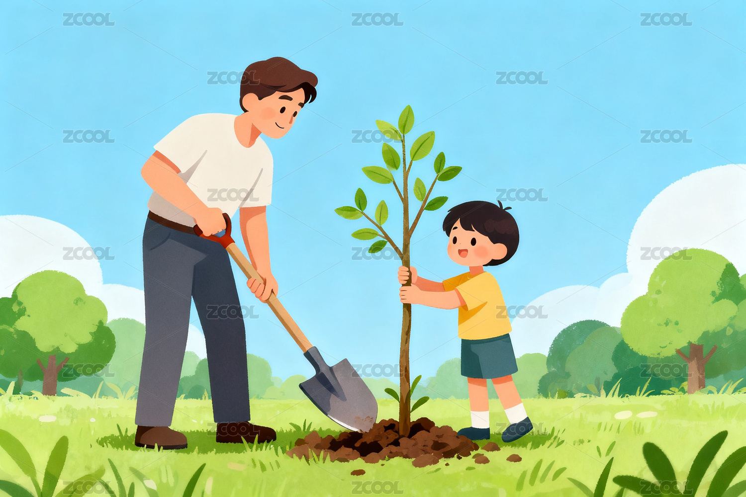 爸爸带着孩子植树矢量插画海报