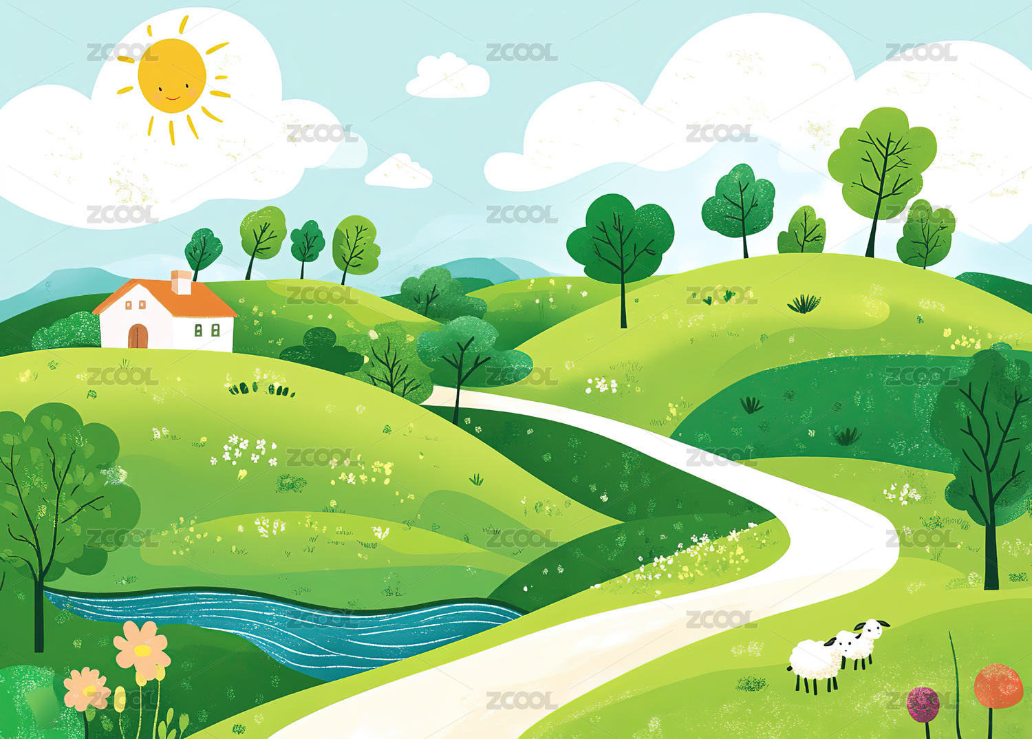 春季乡间田园河流插画