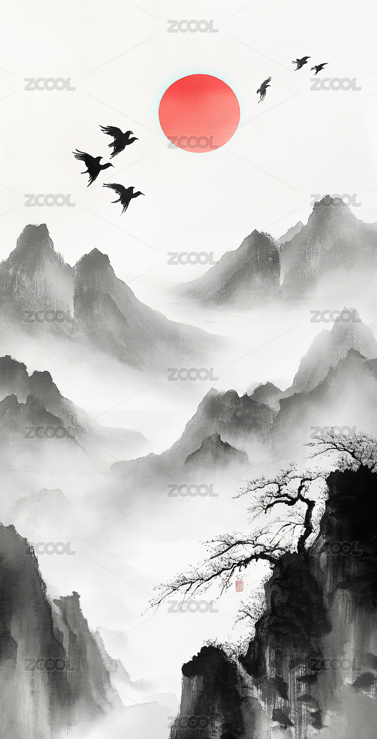 无人,自然,户外,水墨画,中国文化,写意画,插画,中国画,日落,宁静