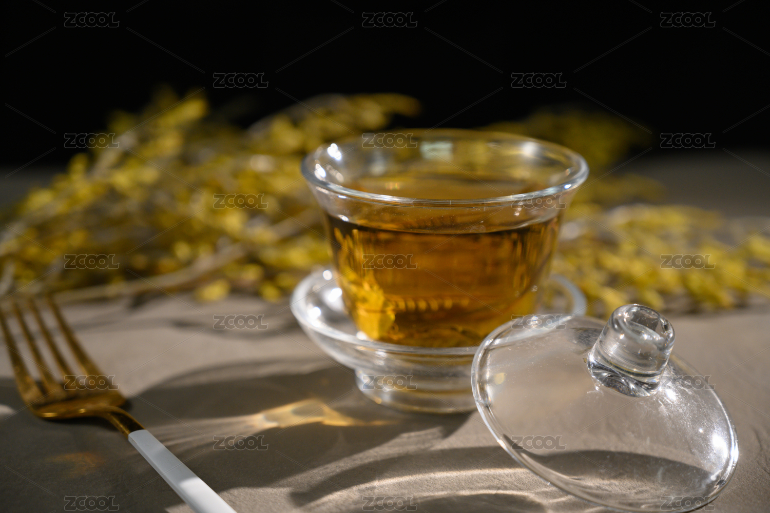 一盏泡着黄色菊花茶的玻璃茶碗
