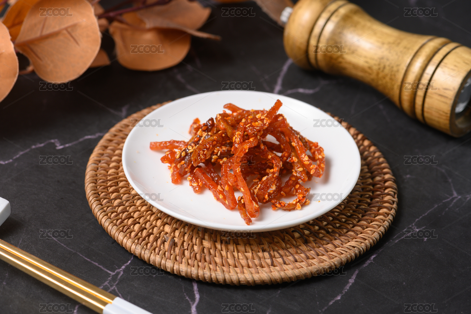 桌面上盘子里的美味可口的麻辣鳗鱼丝