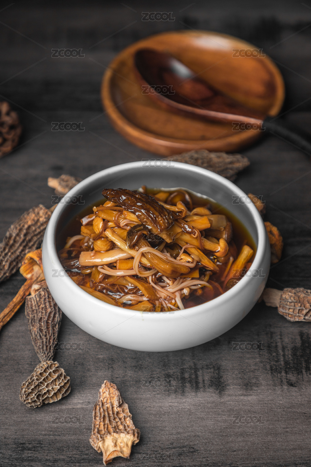 白色汤盆装的至尊菌皇汤摆放在黑色鹅卵石上