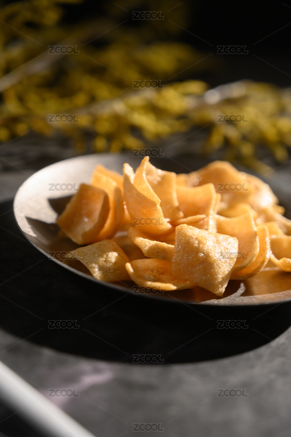 桌面上的盘子里的美味课口的冻干水蜜桃干